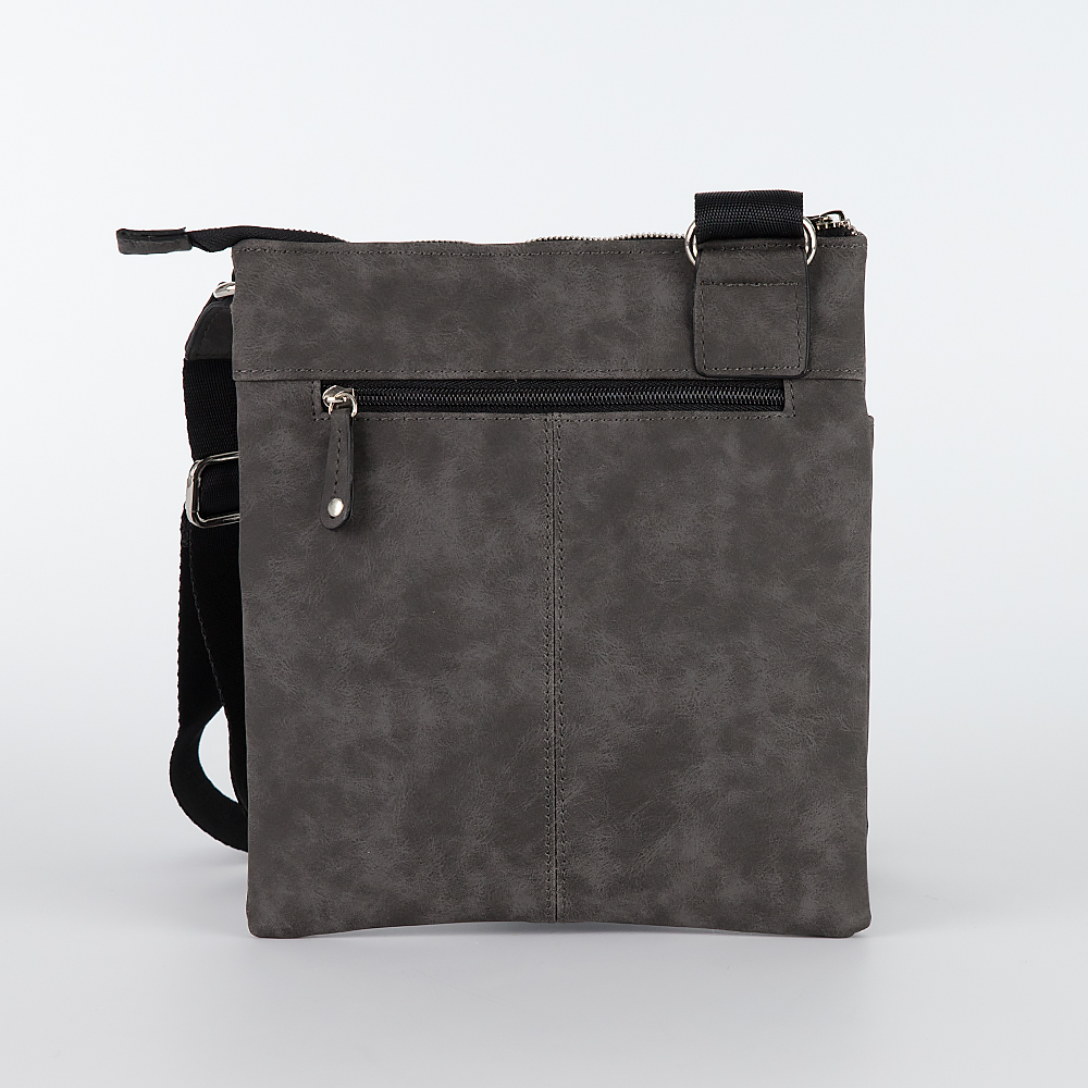 Сумка-планшет от торговой марки Mr.Bag из искусственной кожи серого цвета. Компактная плоская модель с несъемным регулируемым плечев ым ремнем. Отделение на молнии. Внутри: текстильная подкладка, накладной карман. На лицевой стороне – два кармана на молнии, на задней – карман на молнии.