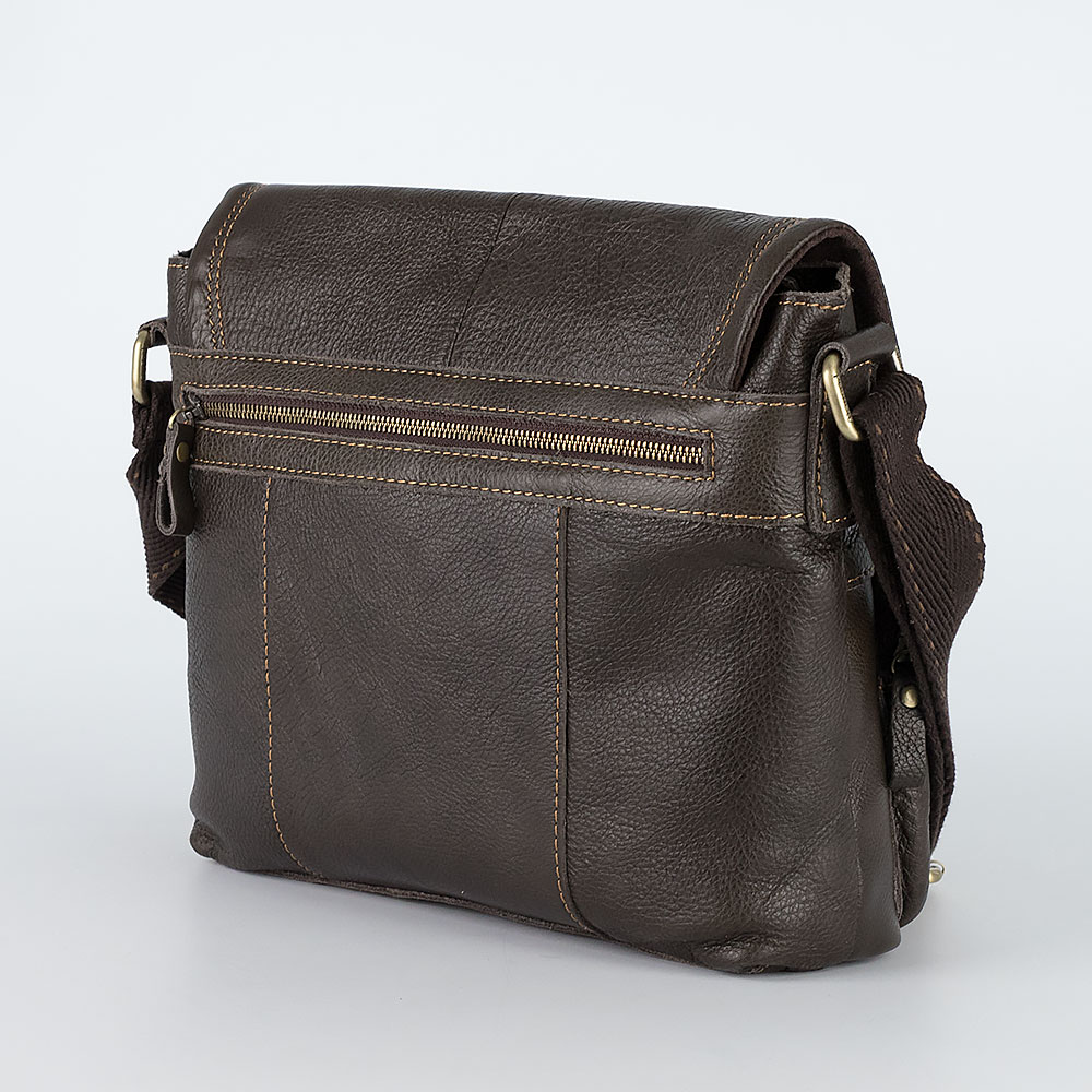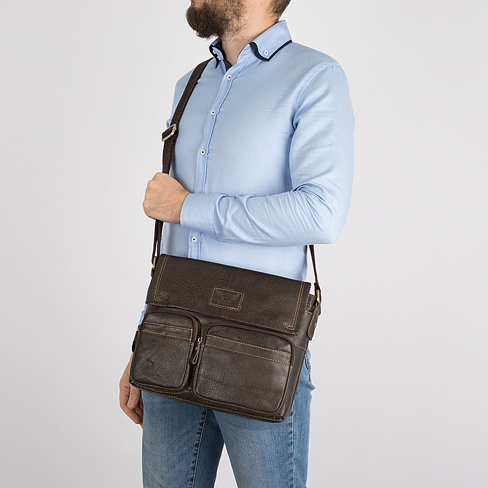 Повседневная мужская сумка от бренда Poshete цвета горького шоколада, с отличным качеством отделки, выполнена из натуральной кожи в сочетании с золотистой металлической фурнитурой. Хорошо подходит для документов и ноутбука. Сумка на регулируемом ремне через плечо из мешковидной ткани. Снаружи три кармана на молниях, один сзади и два спереди. Основное отделение на молнии и скрыто под клапаном, внутри текстильная подкладка и специализированные карманы.