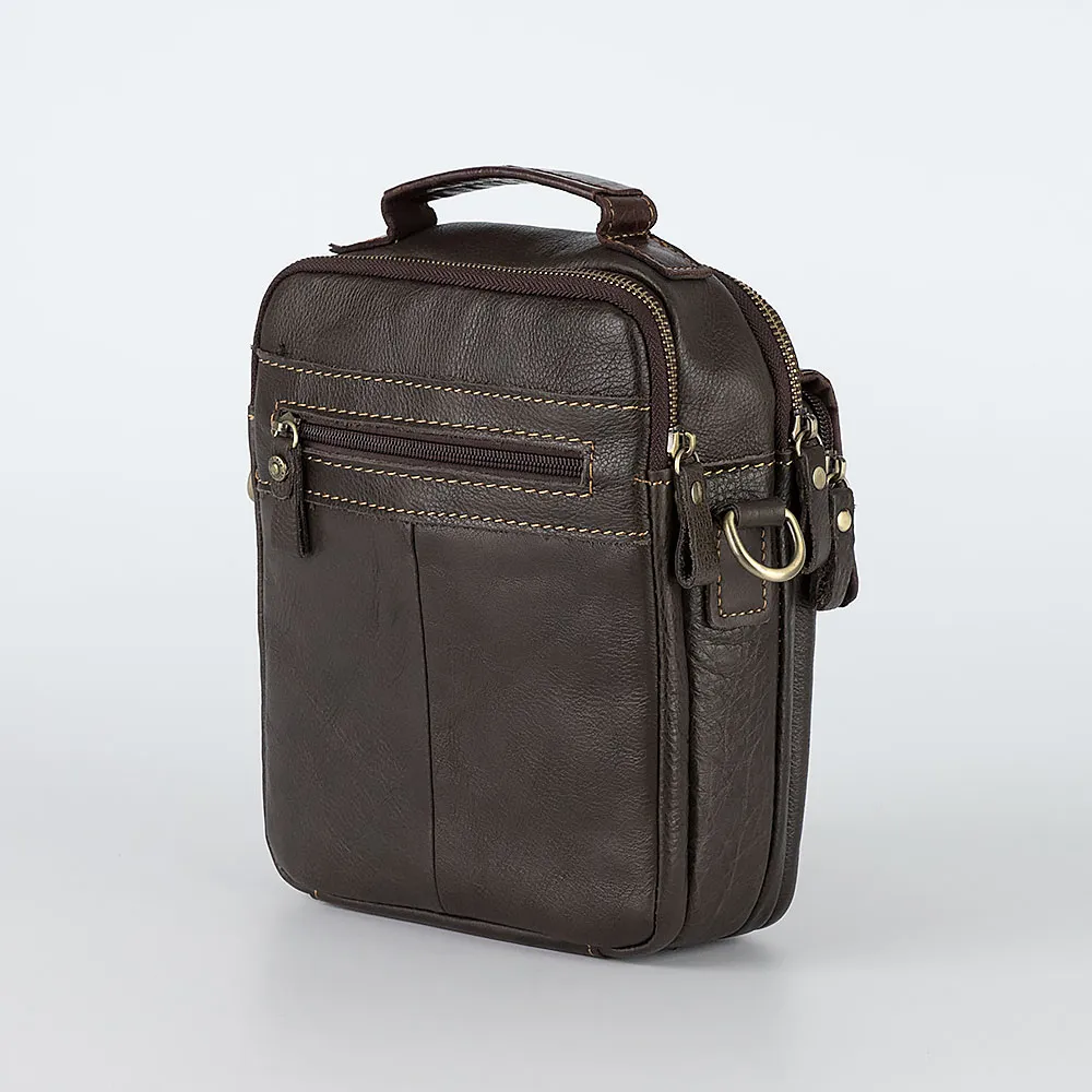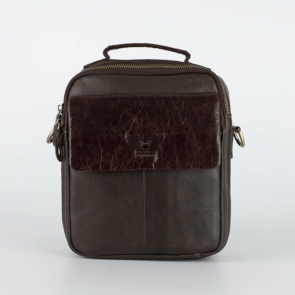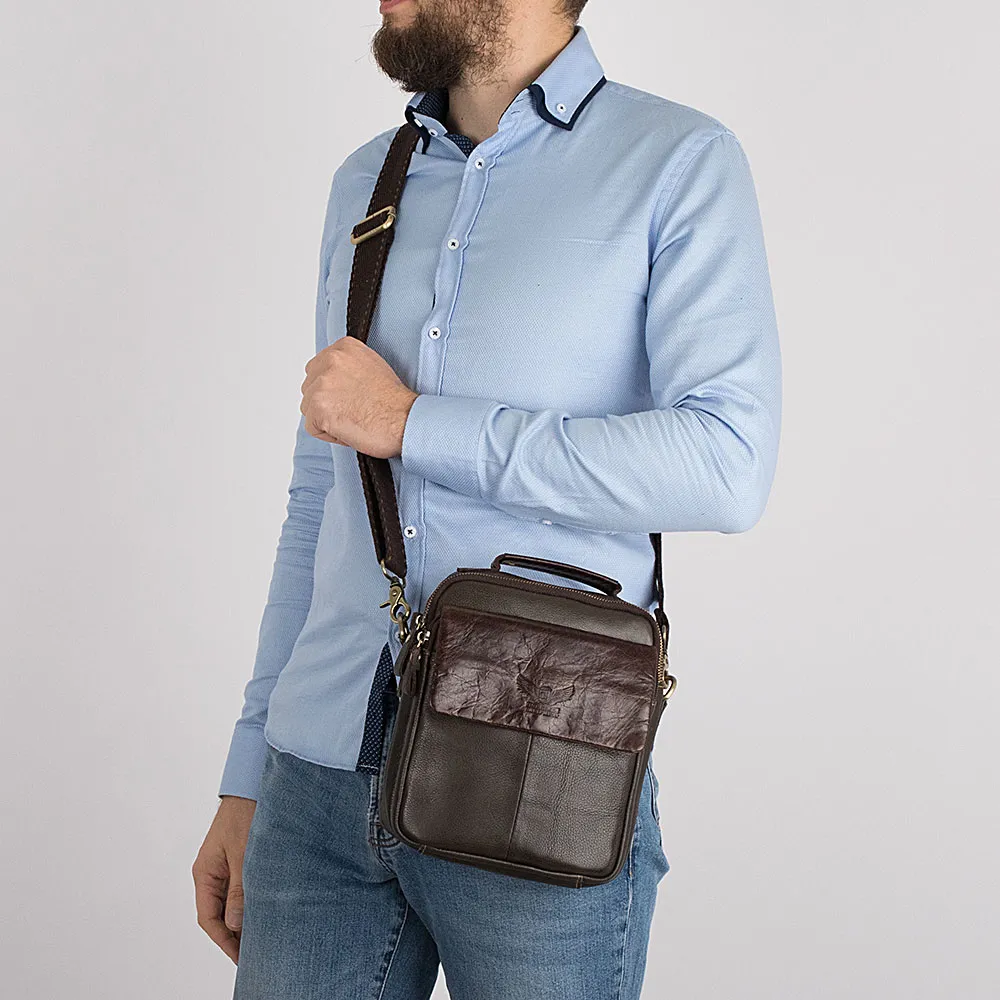 Повседневная мужская сумка через плечо от Poshete выполнена из натуральной мягкой кожи темно-коричневого цвета и дополнена металлической фурнитурой медного цвета. Модель с двумя отделениями под металлическими молниями. Внутри текстильная отделка и несколько кармашков для мелочей. Снаружи накладной карман под молнией и откидным клапаном на магните и прорезной карман на молнии.
