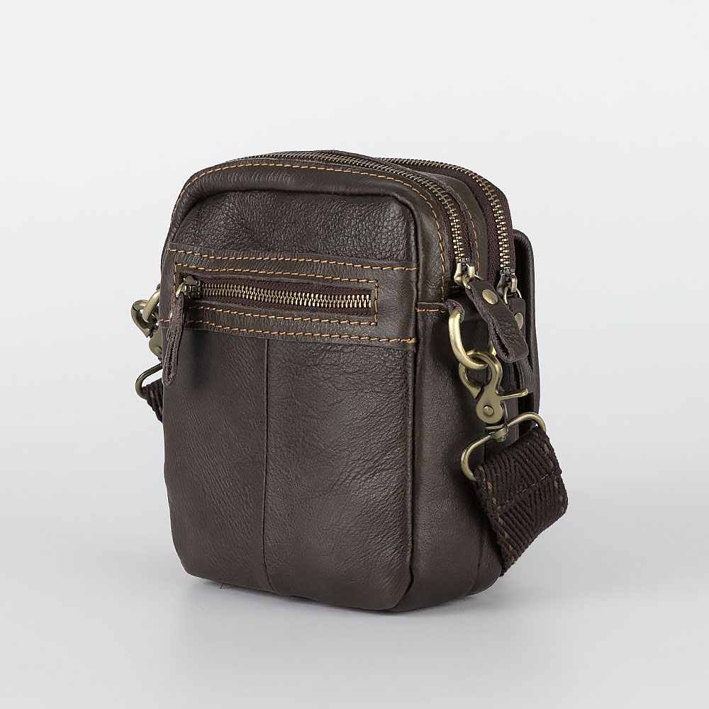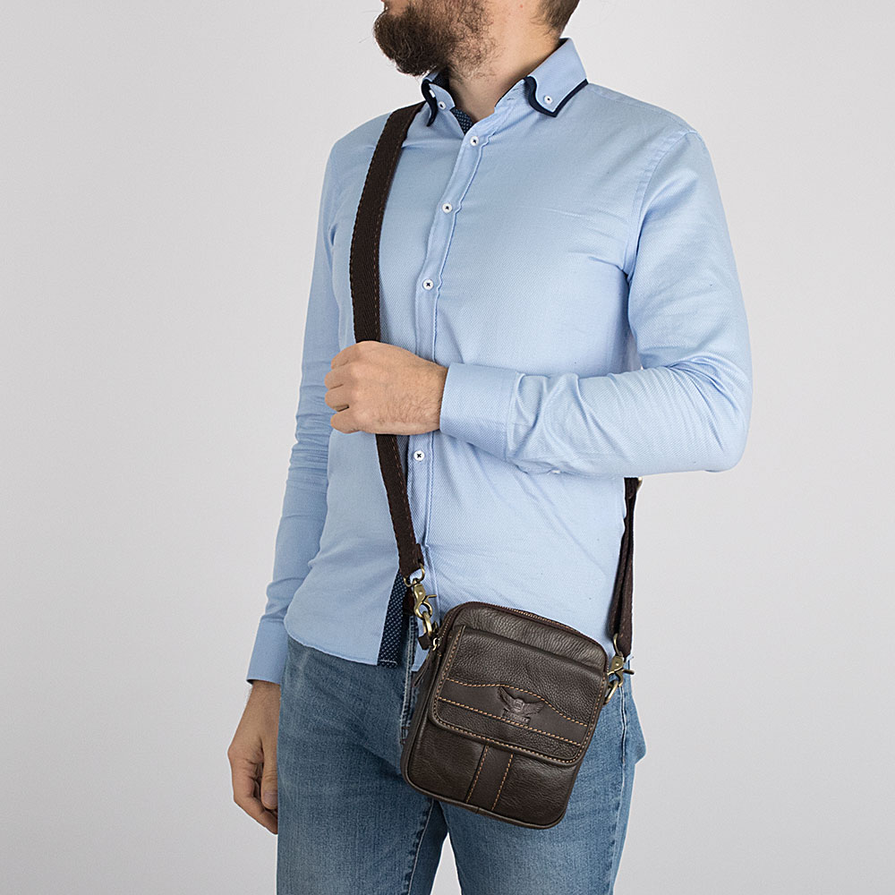 Компактная повседневная сумка-планшет из натуральной кожи от бренда Poshete. Клапан на лицевой стороне, под которым просторный карма н, украшен кожаной фигурной брендированной нашивкой. У сумки два основных отделения, закрывающихся на молнии. Для мелких ценных вещей на задней стороне аксессуара еще один прорезной карман на молнии. Регулируемый плечевой ремень из мягкой ткани пристегивается на карабинах. Цвет аксессуара - насыщенно-коричневый.