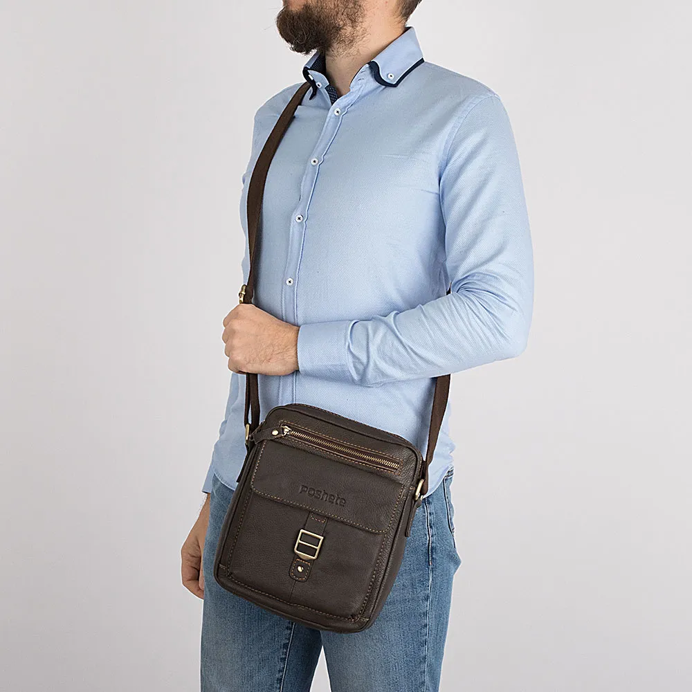 Стильная удобная мужская сумка из натуральной кожи от бренда Poshete. Клапан на лицевой стороне украшает декоративная пряжка приглуш енно-золотистого цвета. На лицевой и задней сторонах есть прорезные карманы на молниях. Под клапаном еще один вместительный карман. Внутренняя часть отделана плотной брендированной подкладкой. Сумка носится через плечо на регулируемом плечевом ремне из текстиля. Цвет модели - темно-коричневый.