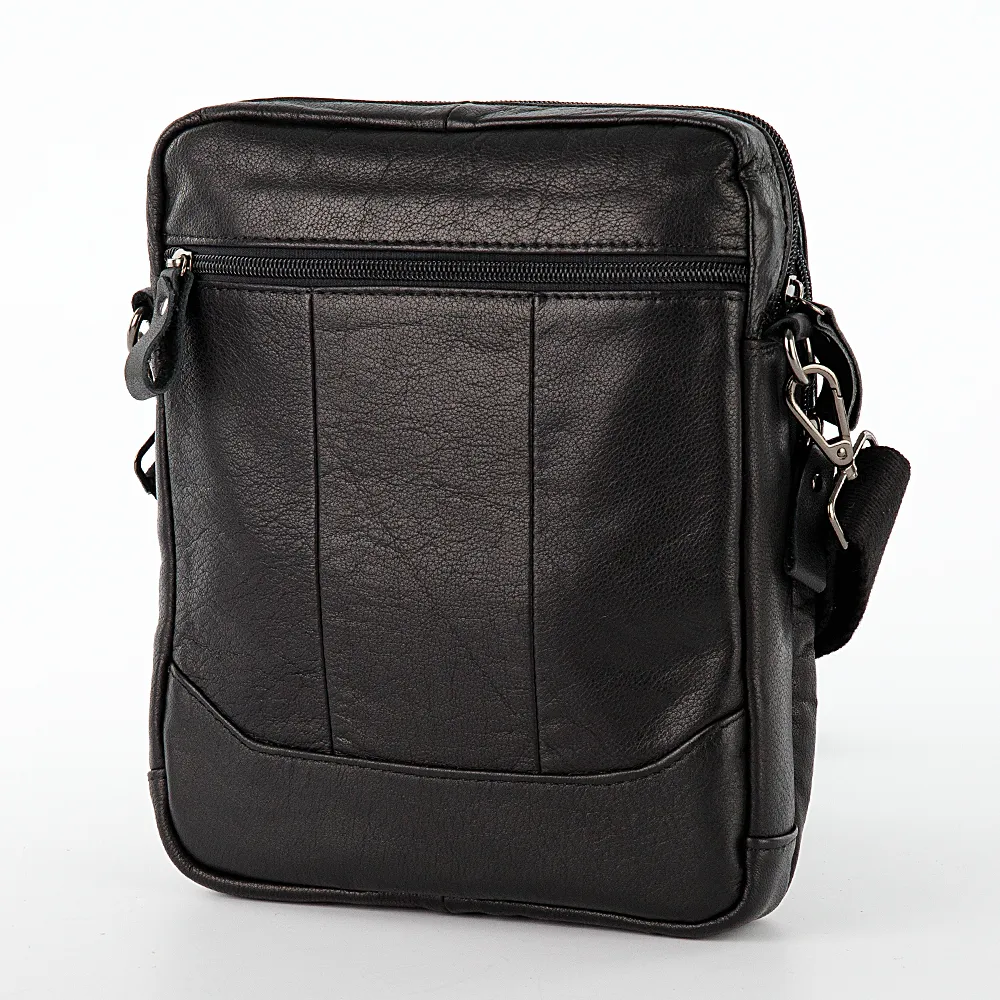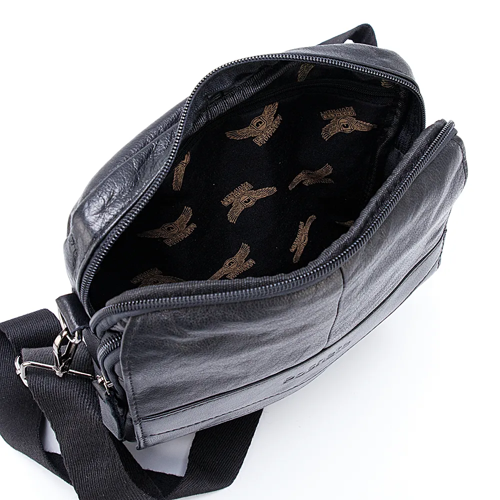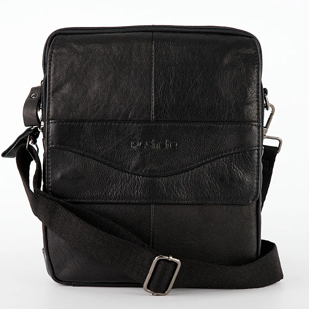 Сумка кросс-боди от торговой марки Poshete из натуральной кожи черного цвета. Модель со съемным регулируемым плечевым ремнем. Отделе ние на молнии с фирменной подкладкой и карманом на молнии. На лицевой стороне карман на молнии и накладной карман, которые закрываются клапаном на двух магнитных кнопках. На задней стороне – карман на молнии.