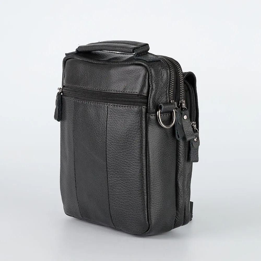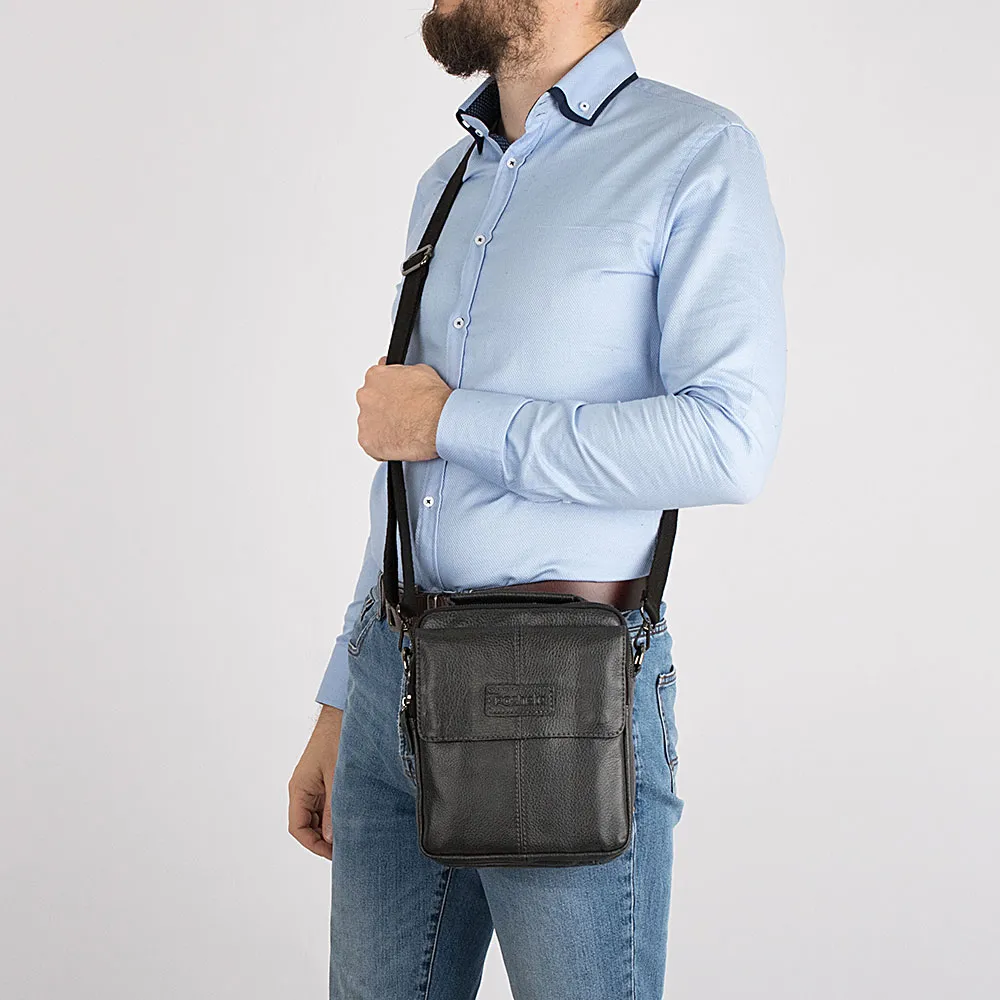 Сумка от торговой марки Poshete из натуральной кожи черного цвета. Компактная модель с одной ручкой и несъемным регулируемым плечевым ремнем, выполненным из текстильного материала. Два отделения на молнии, с фирменной подкладкой. В основном отделении – карман на молнии; в среднем – два накладных кармана. На лицевой стороне карман на молнии, накладной карман без застежки, которые закрываются клапаном на двух магнитных кнопках. На задней – карман на молнии.
