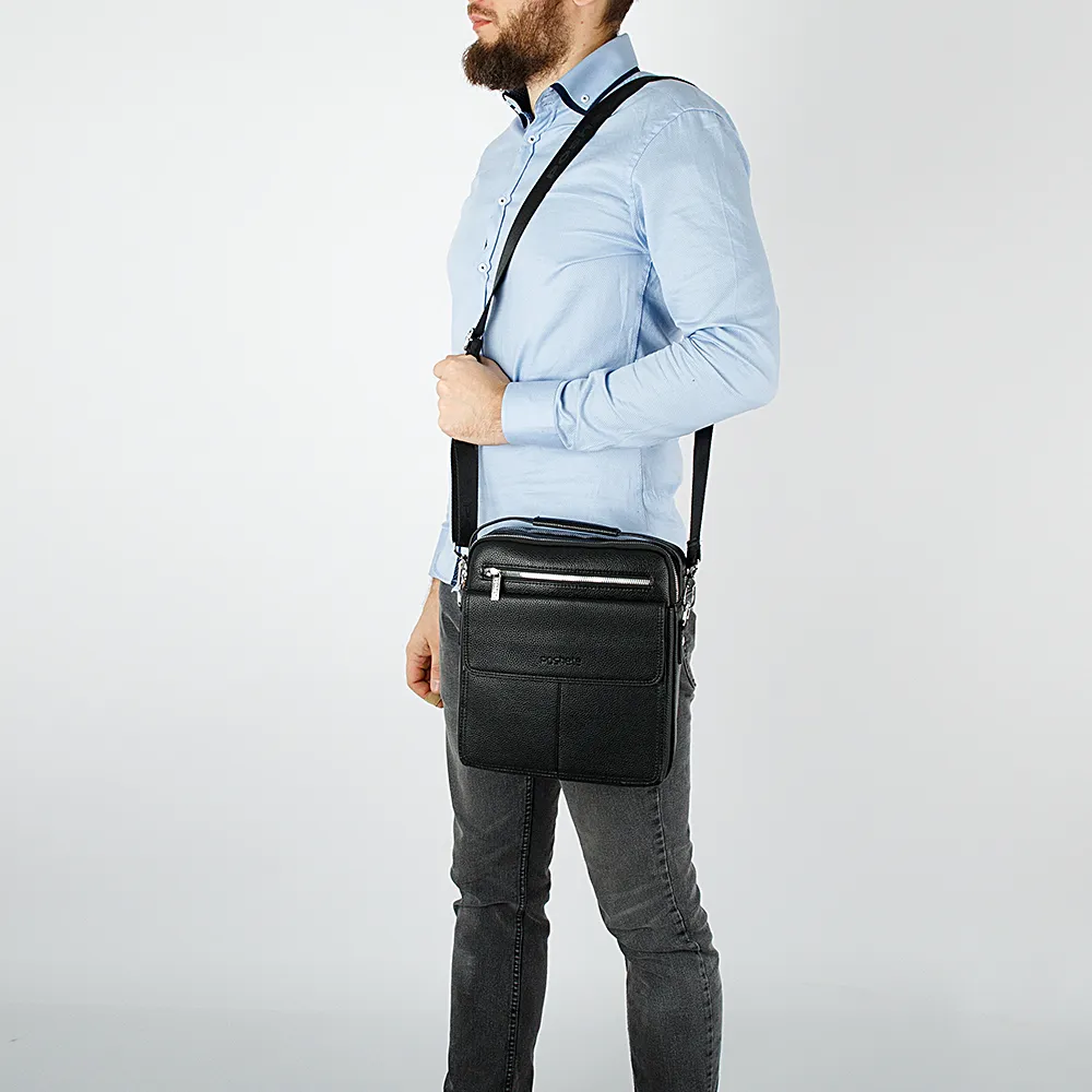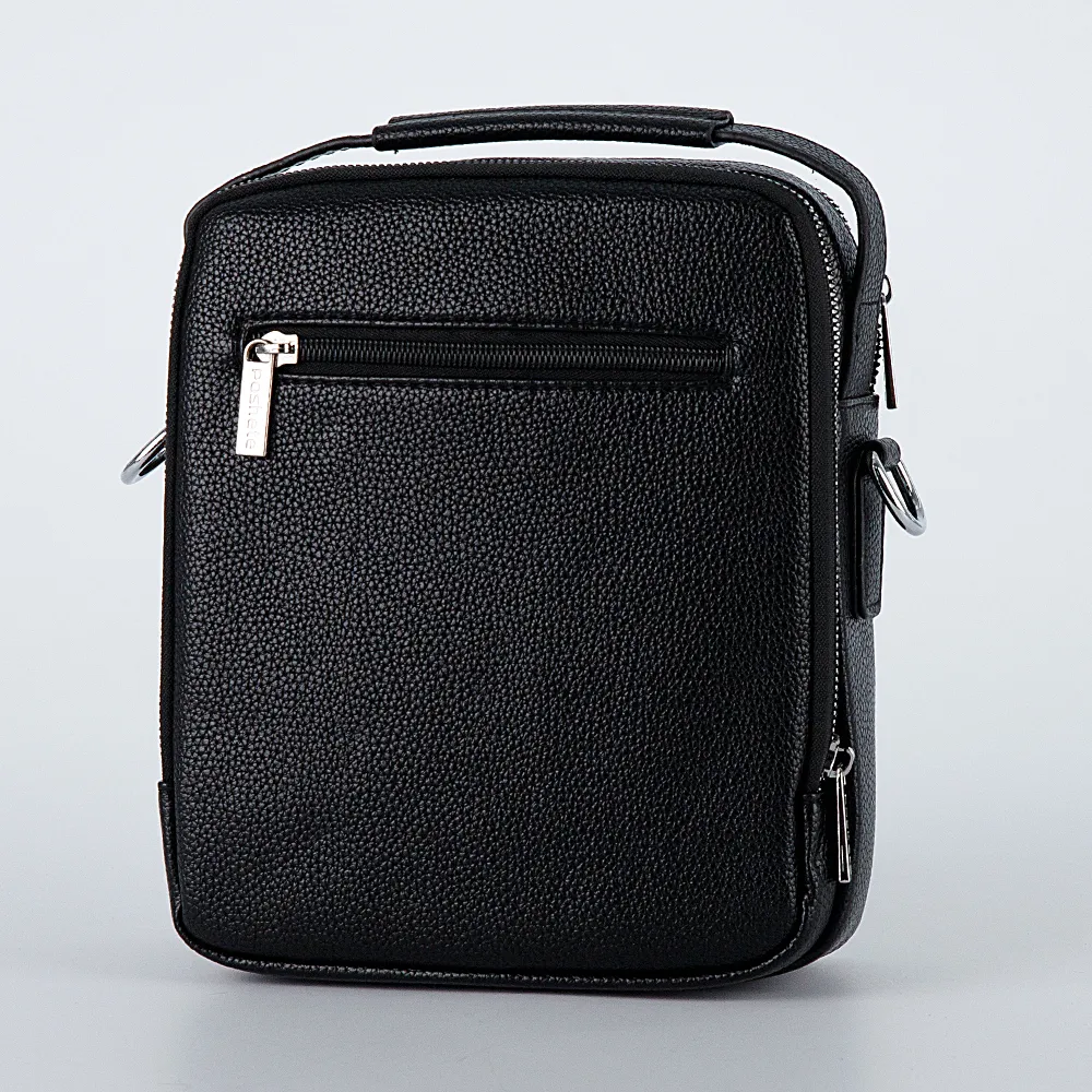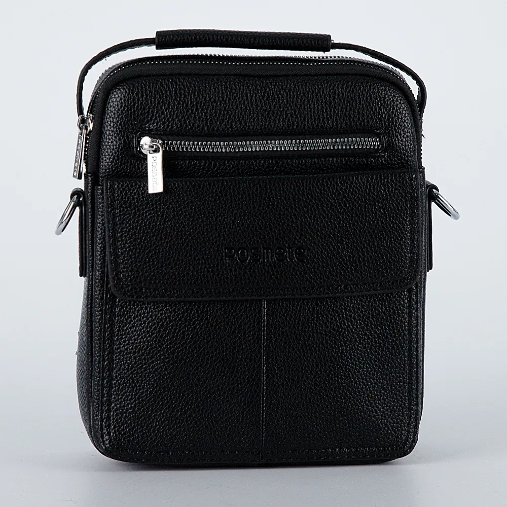 Небольшая мужская сумка от бренда Poshete выполнена из искусственной кожи в чёрном цвете. Сумка прямоугольной формы с закруглёнными углами, имеет текстильный плечевой ремень и ручку повторяющую форму сумки, сзади карман на молнии, спереди прорезной карман на молнии и накладной карман под клапаном на магните. Основное отделение на металлической молнии, внутри дополнительный кармашек, второе отделение тоже на металлической молнии, которая расстёгивается по трём сторонам. Планшет хорошо подойдёт для ipad mini.