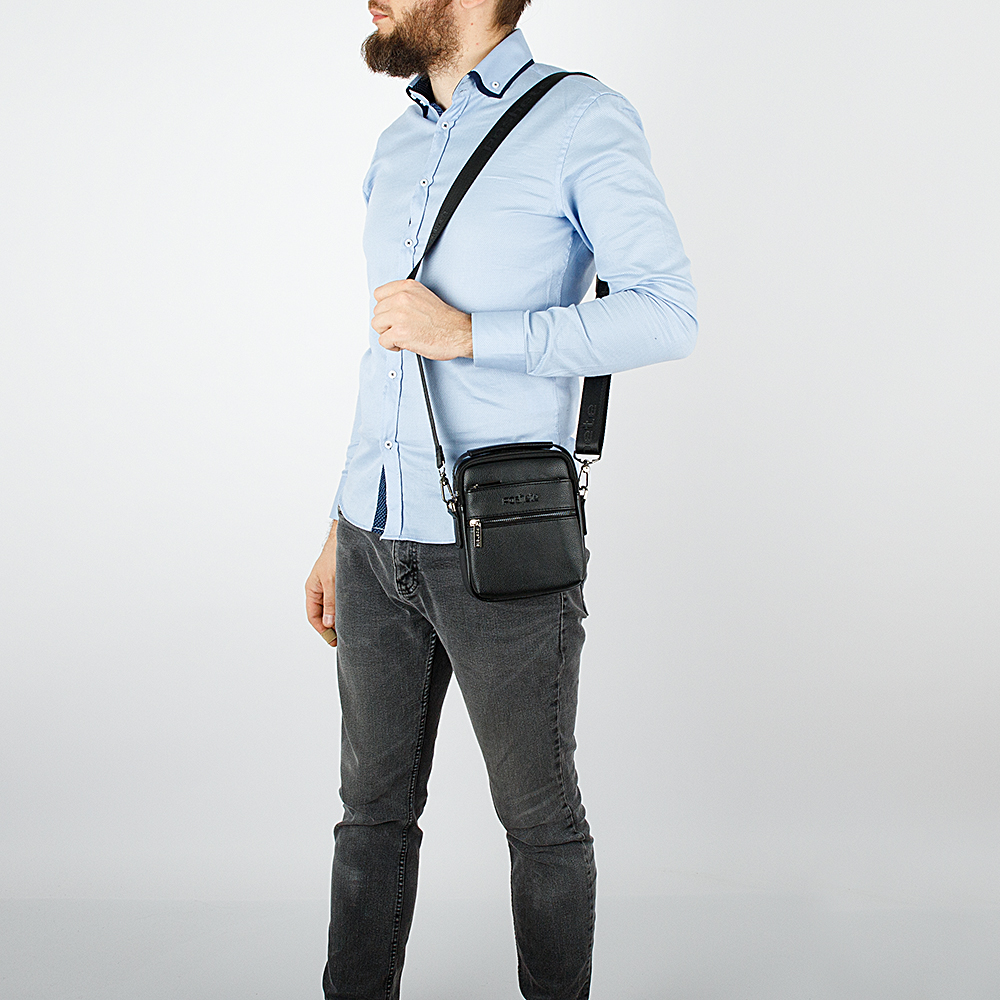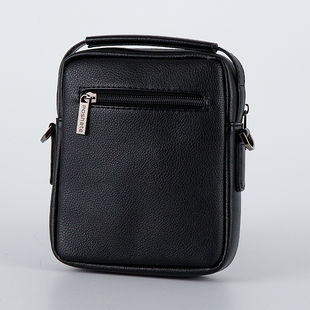 Маленькая мужская сумка на каждый день от бренда Poshete выполнена из мягкой искусственной кожи, с отличным качеством отделки. Сумка чёрного цвета, на съёмном текстильном ремне, который регулируется по длине. Оснащена эргономичной ручкой, которая повторяет мягкий контур сумки. Сзади прорезной карман на молнии, спереди два накладных на молниях. Основное отделение на молнии, внутри два дополнительных кармана. Самые необходимые вещи всегда будут под рукой.