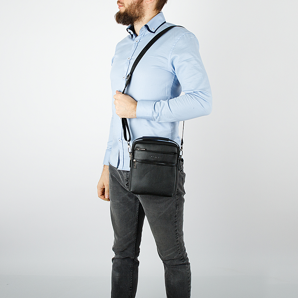 Небольшая мужская сумка на каждый день от бренда Poshete выполнена из мягкой искусственной кожи, с отличным качеством отделки. Сумка чёрного цвета, на съёмном текстильном ремне, который регулируется по длине. Оснащена эргономичной ручкой, которая повторяет мягкий контур сумки. Сзади прорезной карман на молнии, спереди два накладных на молниях. Основное отделение на молнии, внутри два дополнительных кармана. Самые необходимые вещи всегда будут под рукой, подходит для ipad mini.