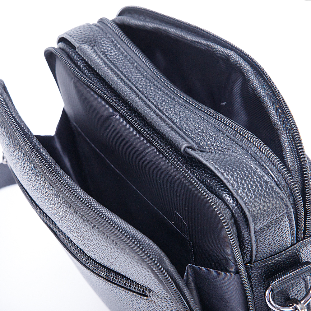 Сумка-планшет от торговой марки Poshete из искусственной зернистой кожи черного цвета. Модель вертикальной ориентации со съемным регулируемым плечевым ремнем, выполненным из текстильного материала. Два отделения на молнии с фирменной подкладкой. Заднее отделение широко раскрывается благодаря молнии по трем сторонам; внутри: карман на молнии, накладной карман. На лицевой стороне – карман на скрытой молнии. На задней – карман на молнии.