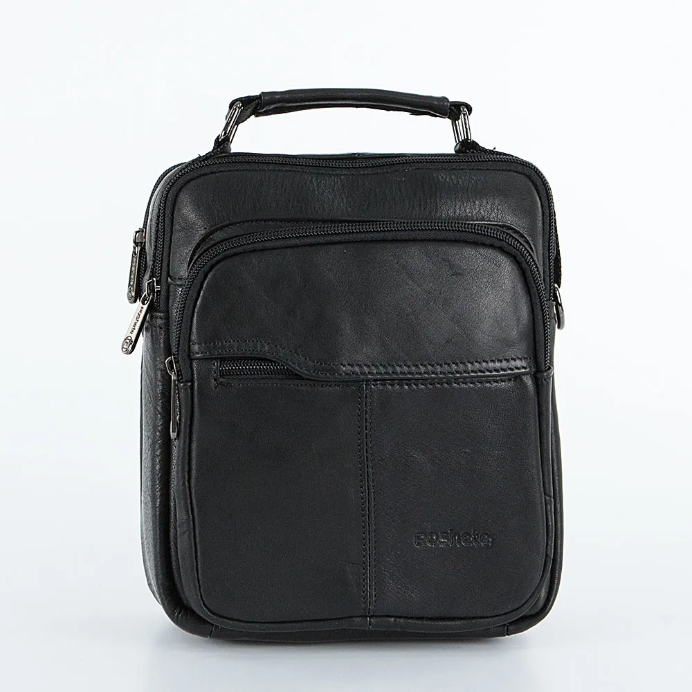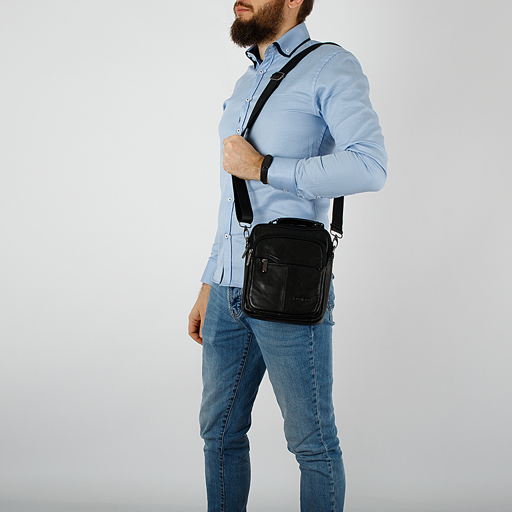 Сумка от торговой марки Poshete из натуральной кожи черного цвета. Модель среднего размера вертикальной ориентации с одной ручкой и съемным регулируемым плечевым ремнем из текстильного материала. Два отделения на молнии с фирменной подкладкой; в одном из них – карман на молнии. На лицевой стороне: накладной и прорезной карманы на молнии. На задней стороне – карман на молнии.