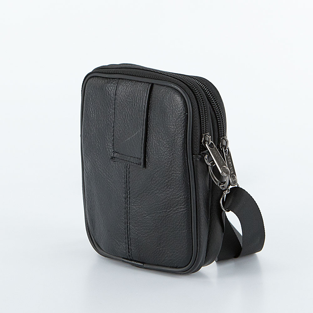 Сумка от торговой марки Poshete из натуральной кожи черного цвета. Компактная модель со съемным регулируемым плечевым ремнем, выполн енным из текстильного материала. Два отделения на молнии с фирменной подкладкой. На лицевой стороне – два кармана на молнии. На задней стороне – шлевка для ношения сумки на поясном ремне.