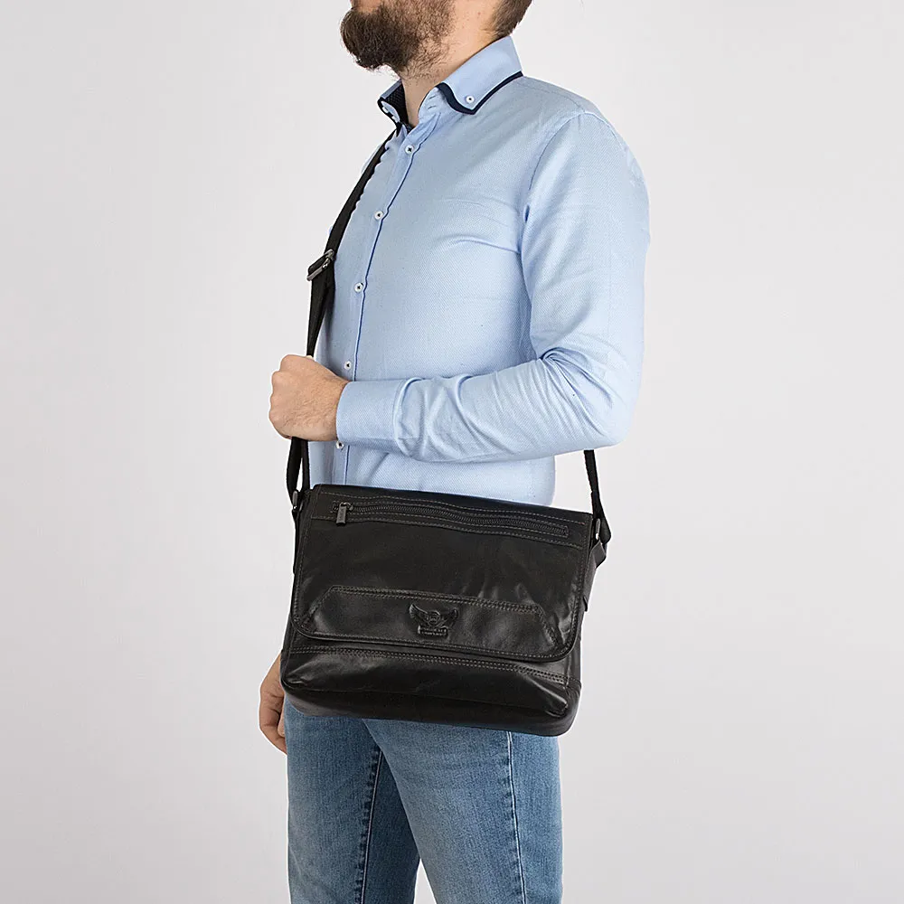 Деловая мужская сумка Poshete из натуральной кожи черного цвета. Застёгивается на молнию и дополнительно закрывается клапаном на магнит, внутри текстильная подкладка, снаружи два кармана на молниях, носится на регулируемом ремне, из текстильного материала, через плечо.