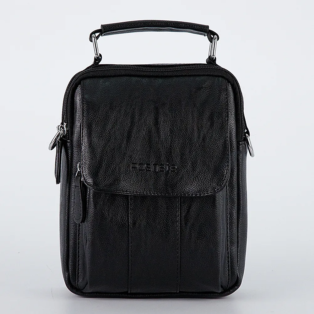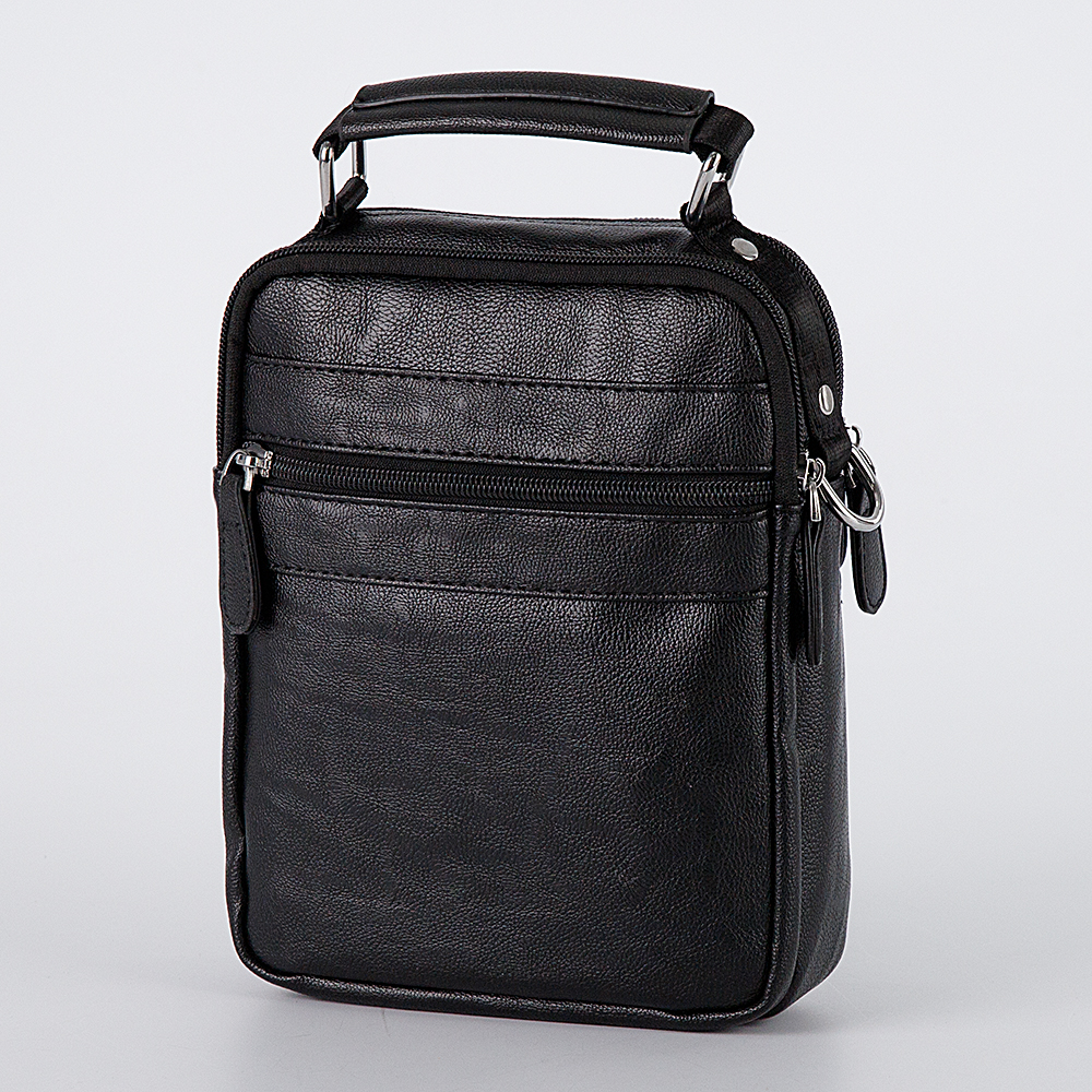 Небольшая мужская сумка Poshete выполнена из искусственной кожи. Модель чёрного цвета, вертикальной прямоугольной формы. Носится через плечо на регулируемом текстильном ремне. Сзади карман на молнии, спереди накладной карман под клапаном на магните. Два основных отделения на молниях, внутри текстильная отделка и карман на молнии. Практичная и повседневная. Плечевой ремень при желании можно отстегнуть, сумка оснащена эргономичной ручкой.