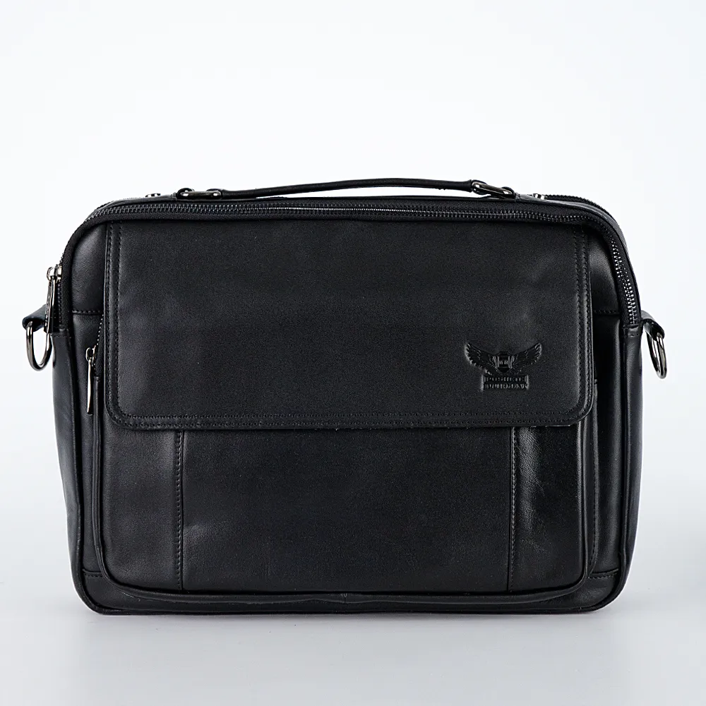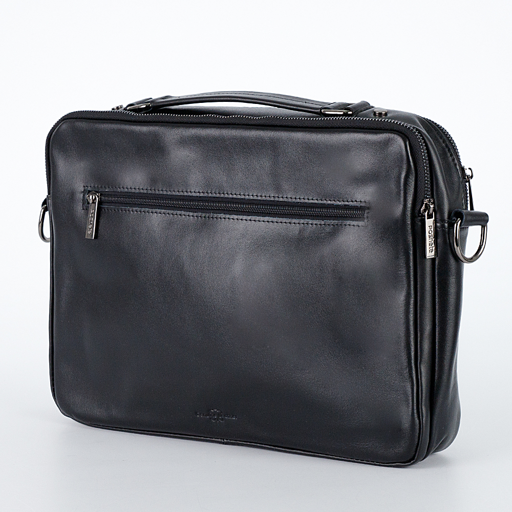 Мужская сумка от торговой марки Poshete выполнена из натуральной кожи черного цвета. Модель с плотной ручкой на кольцах-держателях, со съемным регулируемым плечевым ремнем из текстильного материала. Два отделения на молнии с фирменной подкладкой. В одном из них – карман на молнии, в другом – два накладных кармана. На передней стороне – накладной и прорезной карманы на молнии, которые закрываются клапаном на двух магнитных кнопках. На задней стороне – карман на молнии. Сумка декорирована отстрочкой и тиснением с названием и эмблемой бренда. Размер сумки подойдет для документов формата А4.