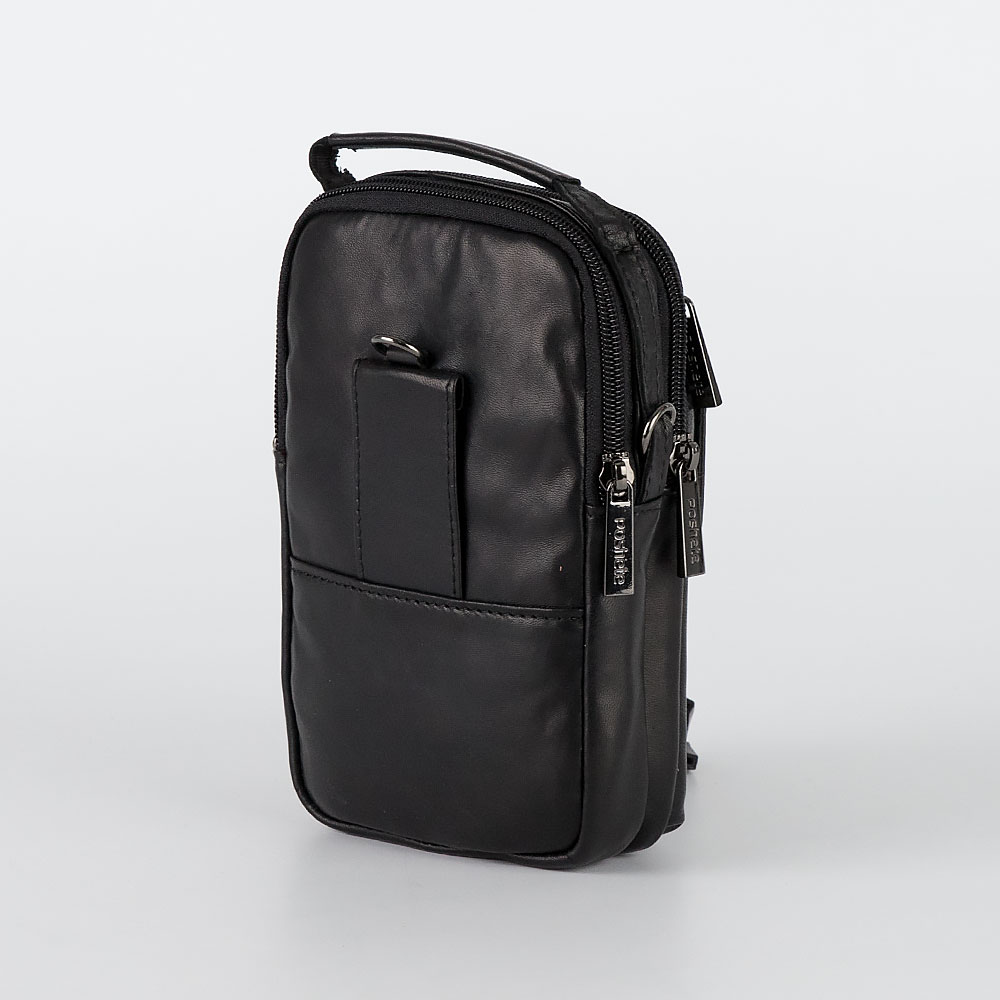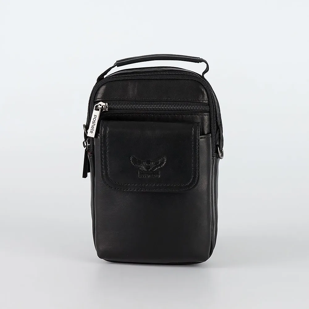 Стильная компактная сумка через плечо от бренда Poshete выполнена из натуральной кожи черного цвета. Модель прямоугольной формы, вертикальной ориентации, с плотной ручкой и съемным регулируемым плечевым ремнем из текстильного материала. Два отделения на молнии, с фирменной подкладкой. В одном из отделений – накладной карман. На лицевой стороне – прорезной карман на молнии, накладной карман с клапаном на двух магнитных кнопках, декорированным тиснением с названием и эмблемой бренда. На задней стороне имеется шлевка для ношения сумки на ремне и карабин для крепления.