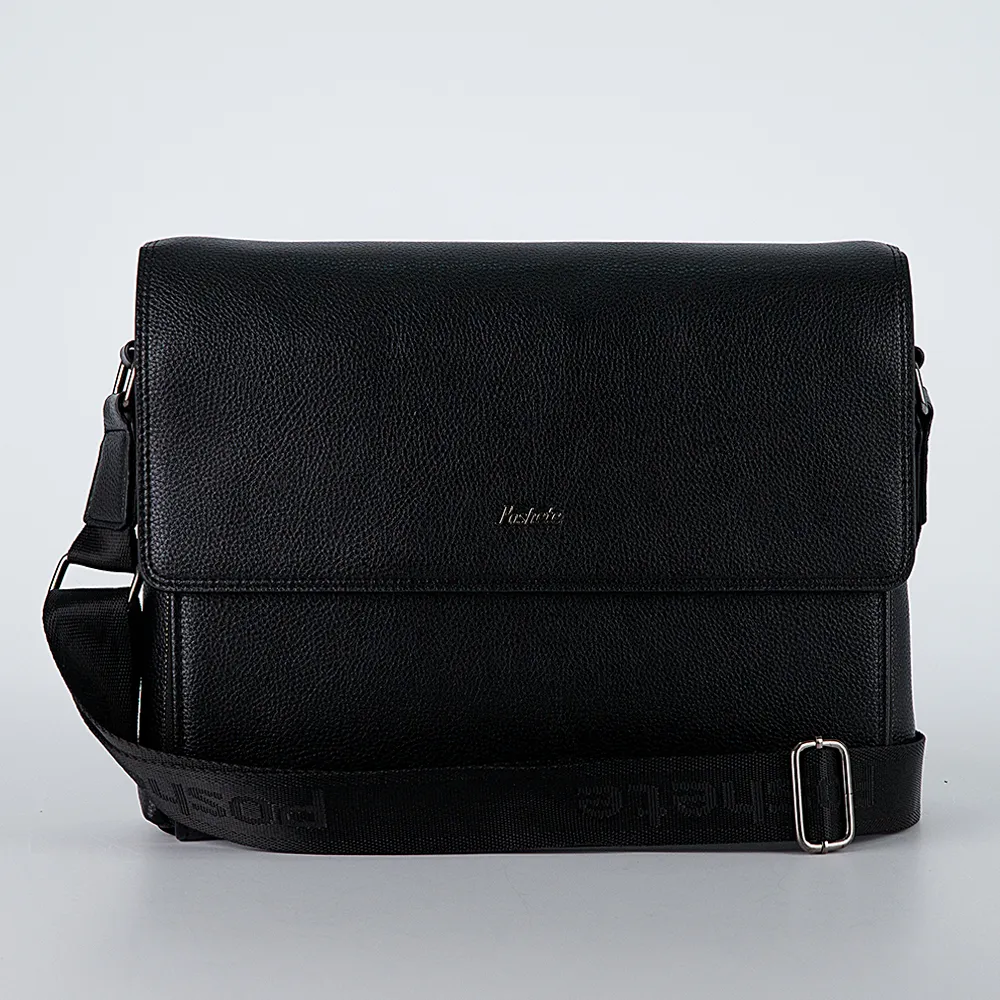Деловая мужская сумка-портфель от бренда Poshete выполнена в чёрном цвете из мягкой искусственной кожи. Модель с лёгкостью вмещает в себя документы. Сумка закрывается на клапан с двумя скрытыми магнитами, под ним накладной карман-папка на молнии, которая расстёгивается по трём сторонам и имеет два кармашка для карточек и основное отделение на молнии, внутри которого три дополнительных кармашка. Снаружи карман на молнии, плечевой ремень текстильный, несъёмный, регулируемый.