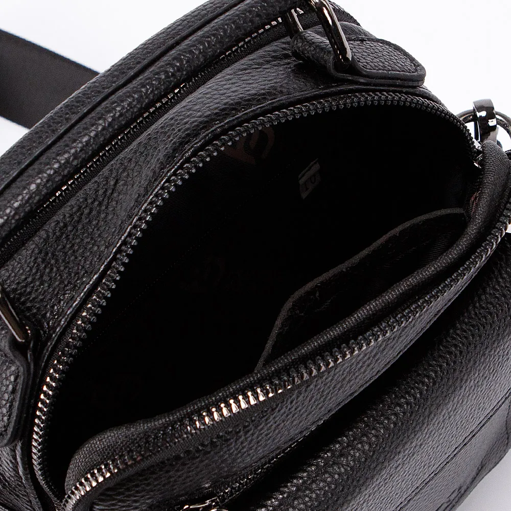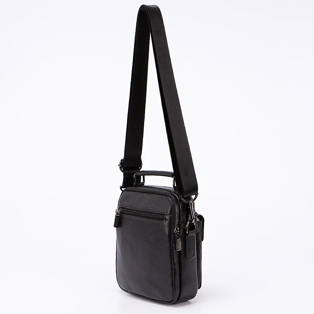 Сумка от торговой марки Francesco Molinary из натуральной зернистой кожи черного цвета. Компактная модель вертикальной ориентации, с ручкой и съемным регулируемыми плечевым ремнем, выполненным из текстильного материала. Два отделения на молнии с фирменной подкладкой. В переднем отделении – два кармана – накладной и на молнии. На лицевой стороне – карман на молнии, накладной карман с клапаном на скрытых магнитах. На задней стороне – карман на молнии.