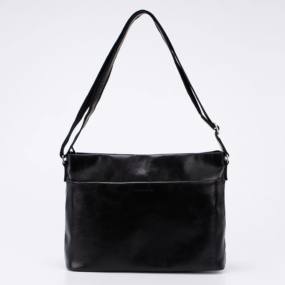 Сумка-планшет от торговой марки Francesco Molinary из натуральной кожи черного цвета. Модель с несъемным регулируемым плечевым ремнем. Отделение на молнии. Внутри: фирменная подкладка, карман на молнии, два накладных кармана. На лицевой и задней сторонах – карман на молнии.