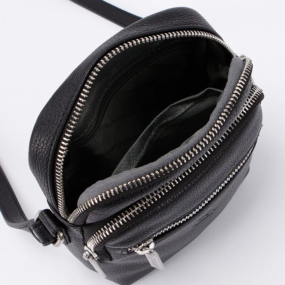 Сумка-планшет от торговой марки Francesco Molinary изготовлена из натуральной кожи черного цвета. Компактная модель с несъемным регулируемым плечевым ремнем. Отделение на молнии. Внутри: фирменная подкладка, карман на молнии, накладной карман. На лицевой стороне – два кармана на молнии. На задней стороне – накладной карман без застежки.