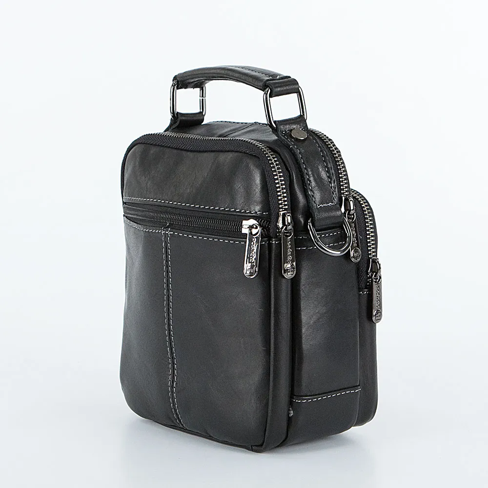 Сумка от торговой марки Poshete из натуральной кожи черного цвета с контрастной отстрочкой. Модель вертикальной ориентации с одной ручкой и съемным регулируемым плечевым ремнем, выполненным из текстильного материала. Два отделения на молнии, с текстильной подкладкой. В заднем отделении – карман на молнии. На лицевой стороне – три кармана на молнии. На задней стороне – карман на молнии.
