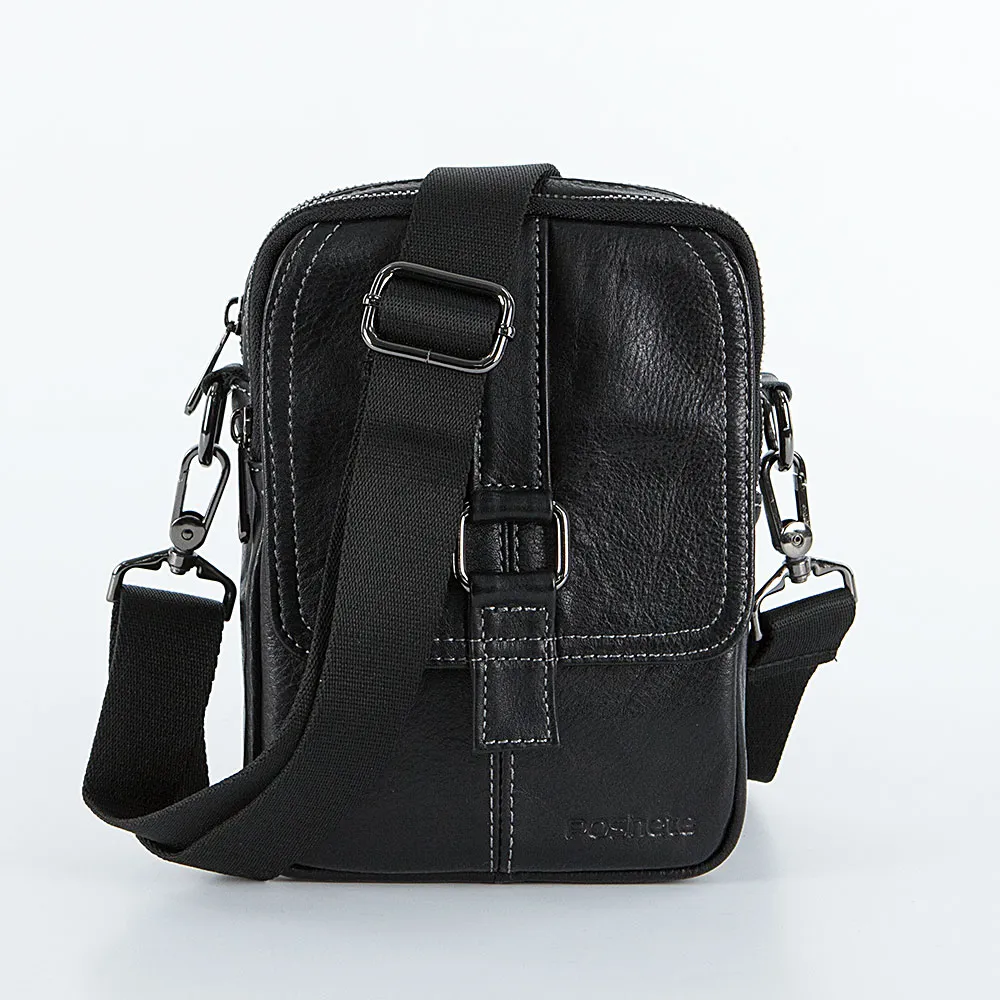 Сумка от торговой марки Poshete из натуральной кожи черного цвета с контрастной отстрочкой. Модель вертикальной ориентации со съемным регулируемым плечевым ремнем, выполненным из текстильного материала. Два отделения на молнии, с текстильной подкладкой. В заднем отделении – карман на молнии. На лицевой стороне – накладной карман с клапаном на магнитной кнопке. На задней стороне – карман на молнии.