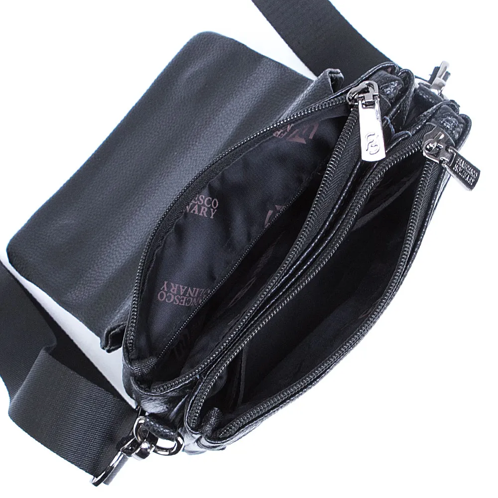 Сумка от торговой марки Francesco Molinary из натуральной кожи черного цвета. Модель со съемным регулируемым плечевым ремнем, выполненным из текстильного материала. Закрывается клапаном на скрытых магнитах. Два отделения на молнии, с текстильной подкладкой. В одном из отделений – карман на молнии, в другом – накладной карман. Между отделениями имеется кармашек. На лицевой стороне – накладной карман без застежки. На задней стороне – карман на молнии.