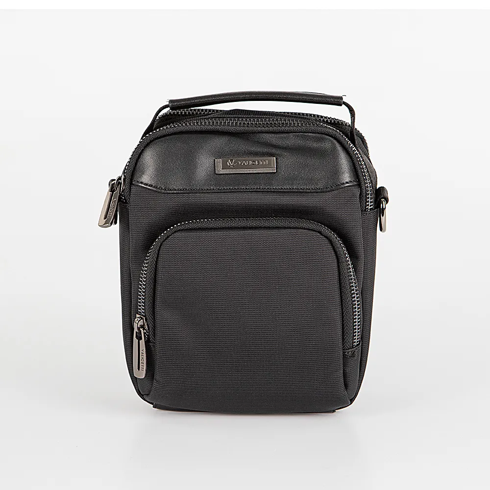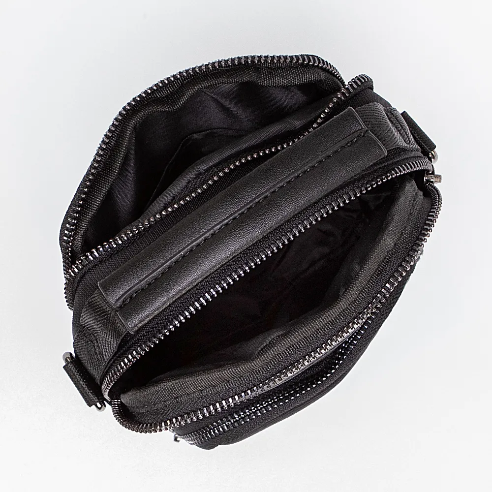 Сумка от торговой марки Valigetti из прочного текстильного материала и искусственной кожи черного цвета. Компактная модель с одной ручкой и съемным регулируемым плечевым ремнем. Два отделения на молнии, с текстильной подкладкой. В заднем отделении – накладной карман. На лицевой и задней сторонах – карман на молнии.
