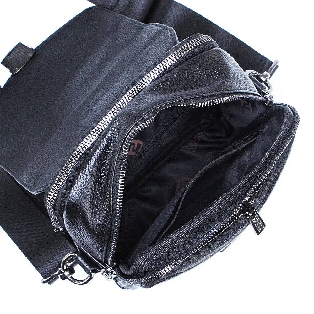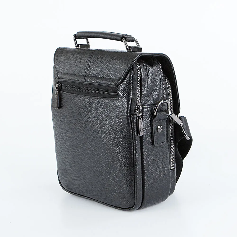 Сумка от торговой марки Francesco Molinary из натуральной кожи черного цвета. Модель вертикальной ориентации с одной ручкой и съемным регулируемым плечевым ремнем, выполненным из текстильного материала. Клапан на цупферном замке закрывает накладной карман на молнии и два отделения на молнии. В основном отделении – карман на молнии, накладной карман. На задней стороне – карман на молнии.