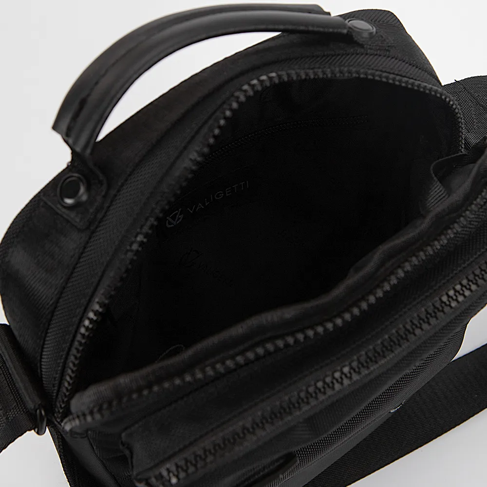 Сумка от торговой марки Valigetti из прочной текстильной ткани черного цвета. Компактная модель с одной ручкой и несъемным регулируемым плечевым ремнем. Отделение на молнии. Внутри: текстильная подкладка, накладной карман с уплотненной стенкой для ноутбука, органайзер, крепление для ключей. На лицевой стороне – два кармана на молнии. На задней стороне – карман на молнии.