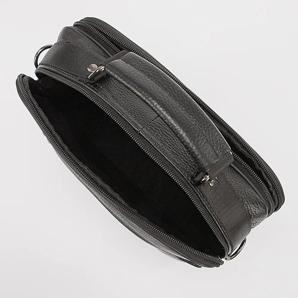 Сумка от торговой марки Poshete из натуральной кожи черного цвета. Модель вертикальной ориентации с одной ручкой и съемным регулируемым плечевым ремнем, выполненным из текстильного материала. Два отделения на молнии, с текстильной подкладкой. В заднем отделении – карман на молнии. На лицевой стороне – три кармана на молнии, на задней стороне – два кармана на молнии.