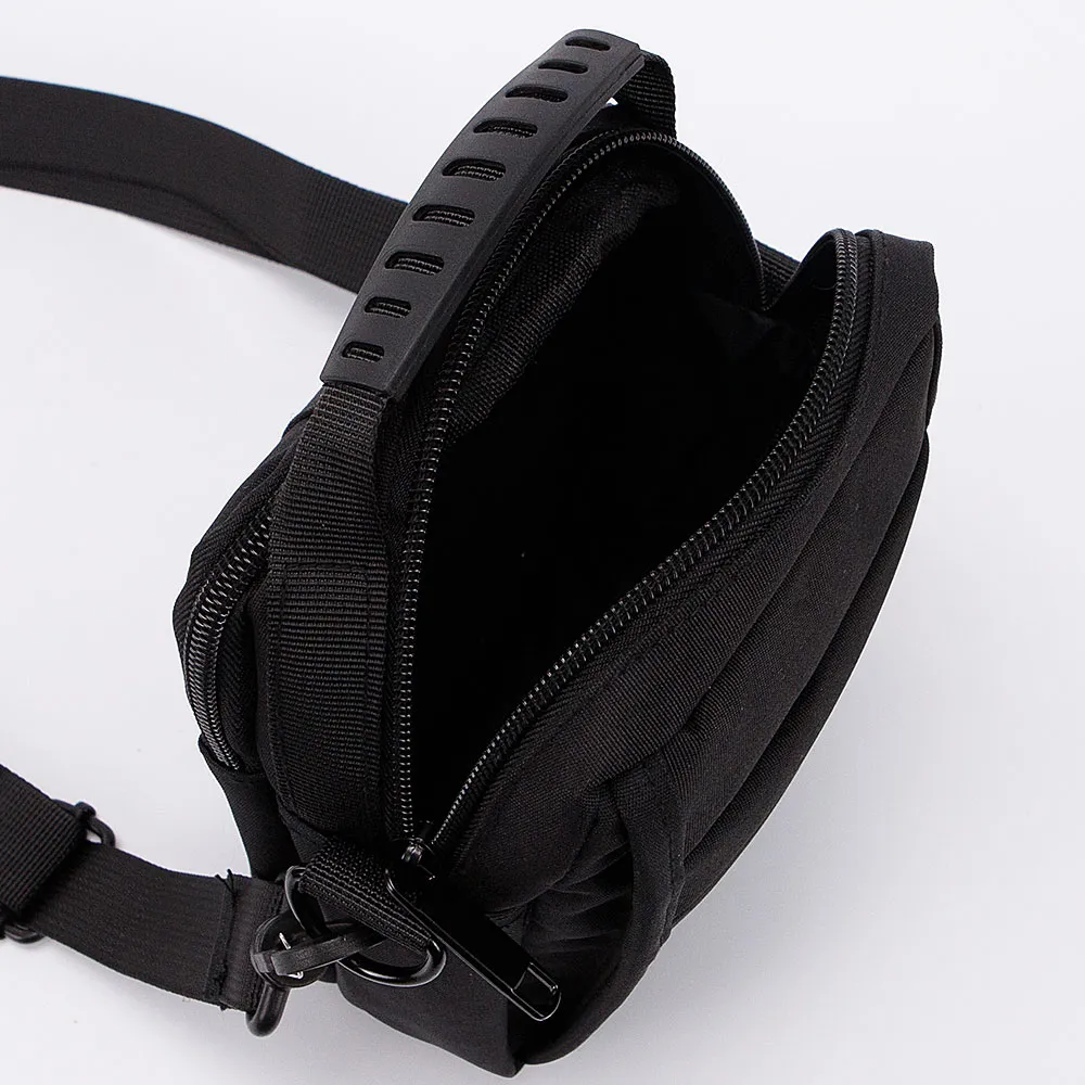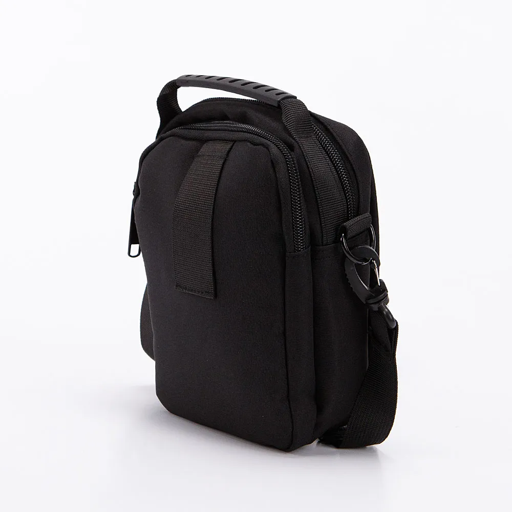 Сумка от торговой марки Valigetti из текстильного материала черного цвета. Модель с одной ручкой с прорезиненной накладкой, съемным регулируемым плечевым ремнем. Два отделения на молнии, с текстильной подкладкой. В одном из отделений – карман на молнии. На лицевой стороне – два кармана на молнии. Сзади имеется шлевка для крепления и ношения на ремне.