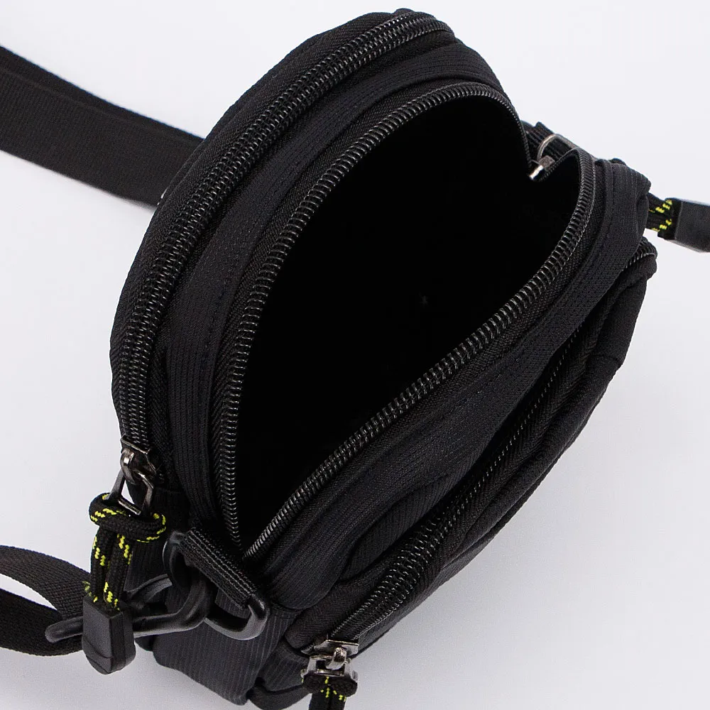 Сумка-планшет от торговой марки Valigetti из текстильного материала черного цвета. Модель со съемным регулируемым плечевым ремнем, который можно крепить как сбоку, так и сзади. Два отделения на молнии, с текстильной подкладкой. В одном из отделений – накладной карман. На лицевой стороне – два кармана на молнии. Сзади имеется шлевка для крепления и ношения на ремне и карабин для крепления.