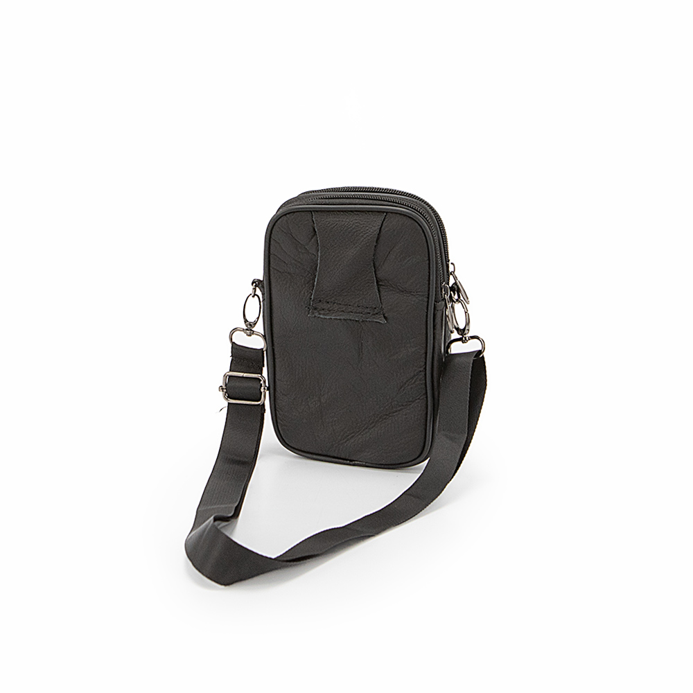 Сумка от торговой марки Poshete из натуральной кожи черного цвета. Модель со съемным регулируемым плечевым ремнем. Два отделения на молнии, с текстильной подкладкой. На лицевой стороне – накладной карман с клапаном и карман на молнии. На задней стороне – лямка для ношения на ремне.