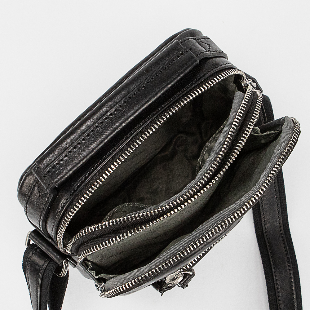 Сумка от торговой марки Francesco Molinary из натуральной кожи черного цвета. Модель с одной ручкой и несъемным регулируемым плечевым ремнем, комбинированным с текстильным материалом. Два отделения на молнии, с фирменной подкладкой. В основном отделении – карман на молнии, накладной карман. На лицевой и задней сторонах – карман на молнии.