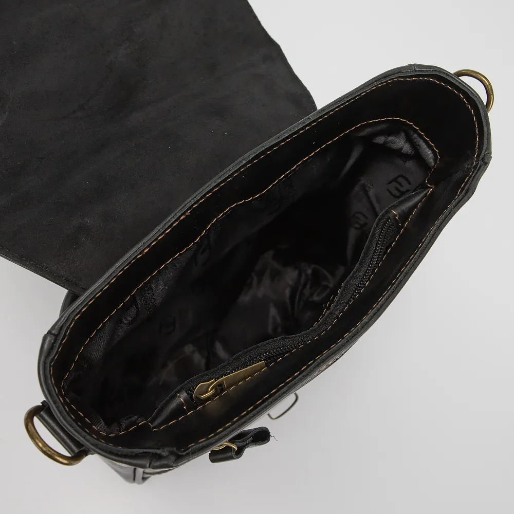 Сумка от торговой марки Francesco Molinary изготовлена из натуральной гладкой кожи черного цвета. Модель с ручкой и съемным регулируемым плечевым ремнем. Отделение закрывается клапаном на цупферном замке. Внутри: фирменная подкладка, карман на молнии, образующий накладной карман. На задней стороне - карман на молнии.