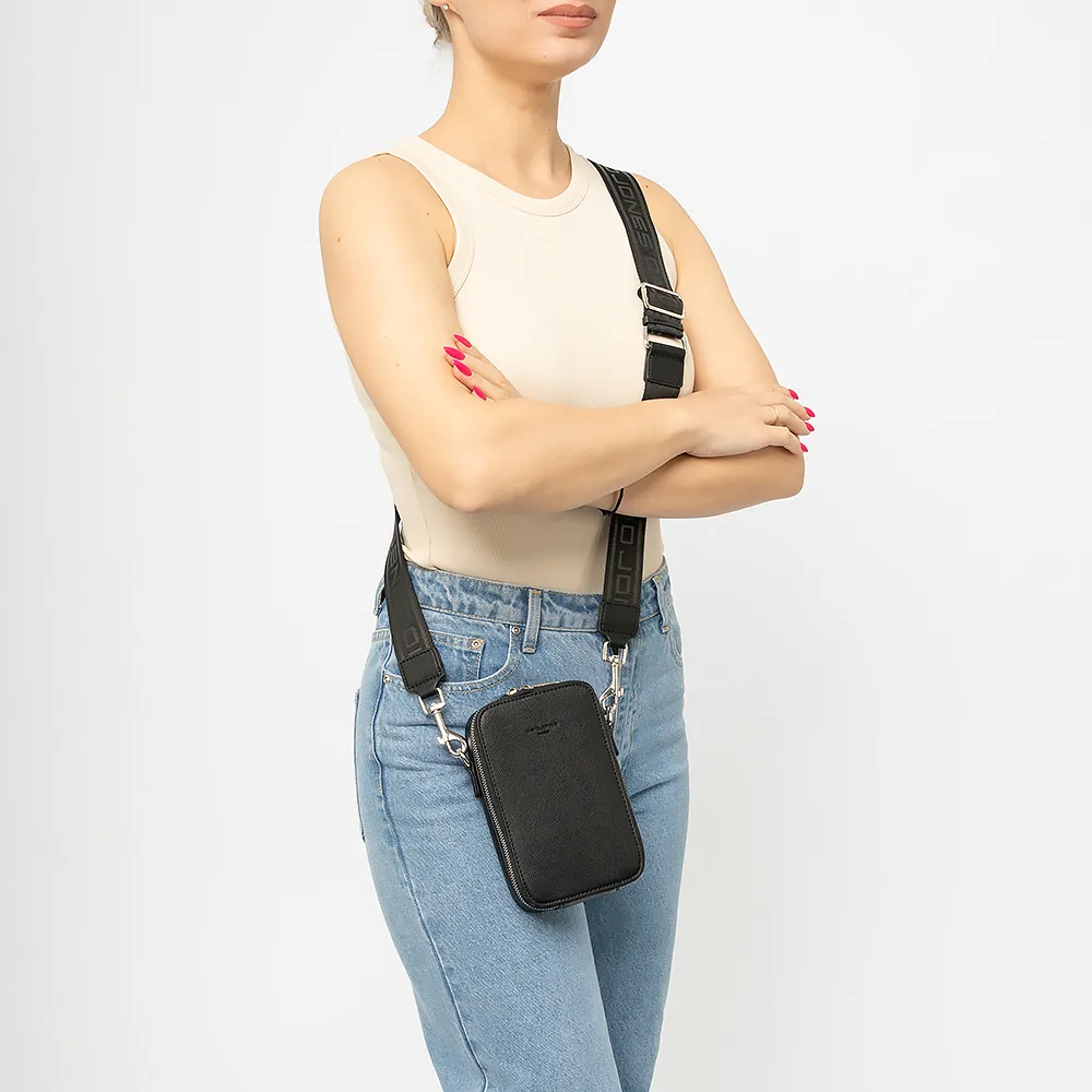 Сумка от торговой марки David Jones из искусственной кожи черного цвета. Компактная модель вертикальной ориентации со съемным регулируемым широким плечевым ремнем. Отделение на молнии со встречными бегунками, раскрывается по трем сторонам. Внутри: фирменная подкладка, карманы для карт. На задней стороне - накладной карман.