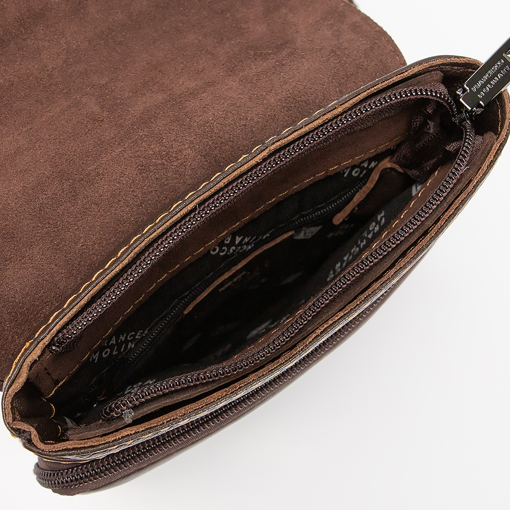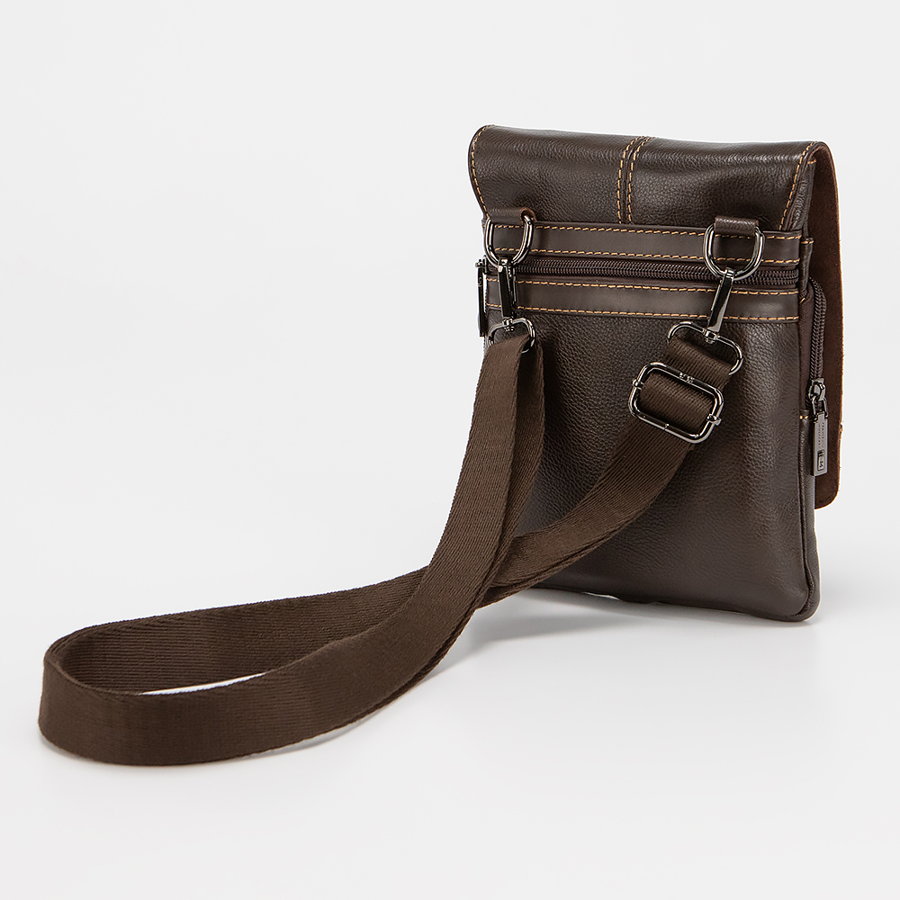 Сумка-планшет от торговой марки Francesco Molinary из натуральной кожи коричневого цвета. Модель со съемным регулируемым плечевым ремнем. Клапан на магнитных кнопках закрывает накладной карман на молнии и отделение с фирменной подкладкой. Внутри карман на молнии, накладной карман. На задней стороне - карман на молнии. На клапане имеется дополнителный карман на молнии.