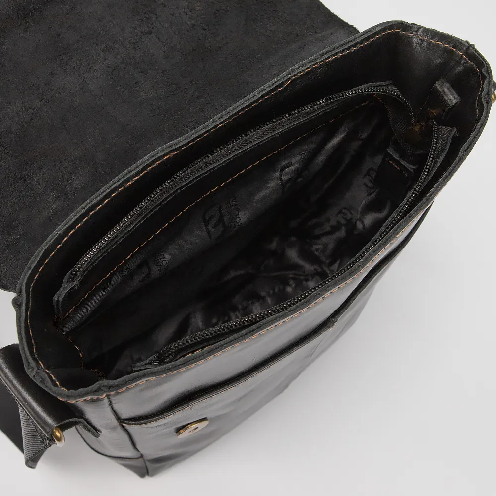Сумка от торговой марки Francesco Molinary изготовлена из натуральной кожи черного цвета. Компактная модель с несъемным регулируемым плечевым ремнем из текстильного материала. Клапан закрывает отделение на молнии. Внутри: фирменная подкладка, карман на молнии, накладной карман. На задней стороне - карман на молнии.