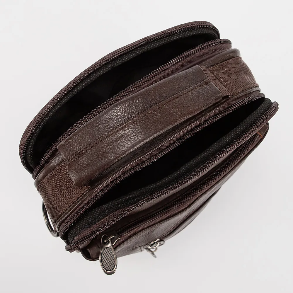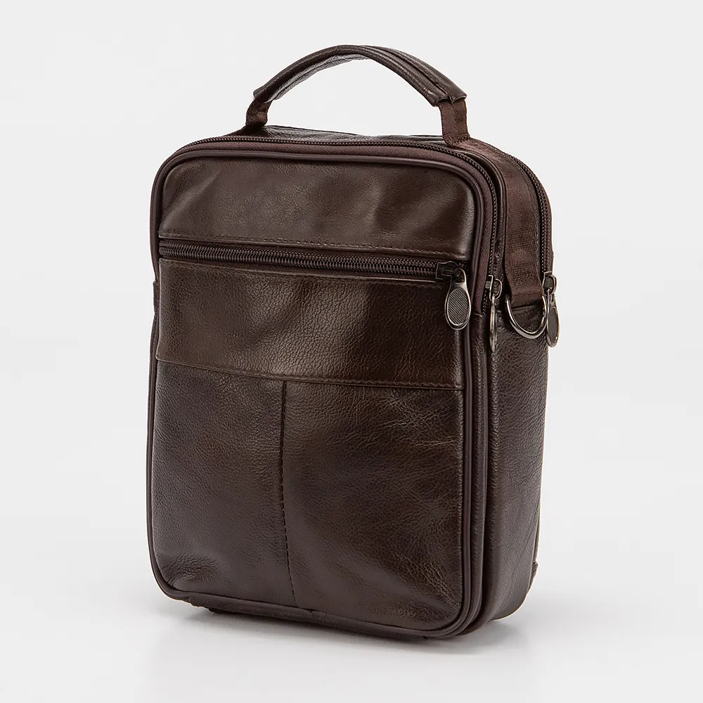 Сумка от торговой марки Valigetti выполнена из натуральной кожи коричневого цвета. Модель с ручкой для переноски и длинным регулируемым плечевым ремнем. Два отделения на молнии. С лицевой стороны - три кармана на молнии. С задней стороны - карман на молнии.
