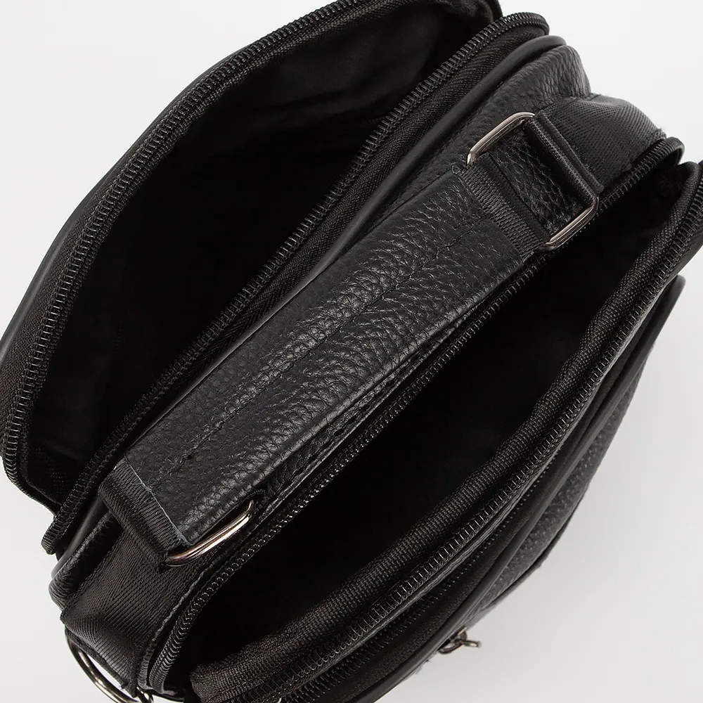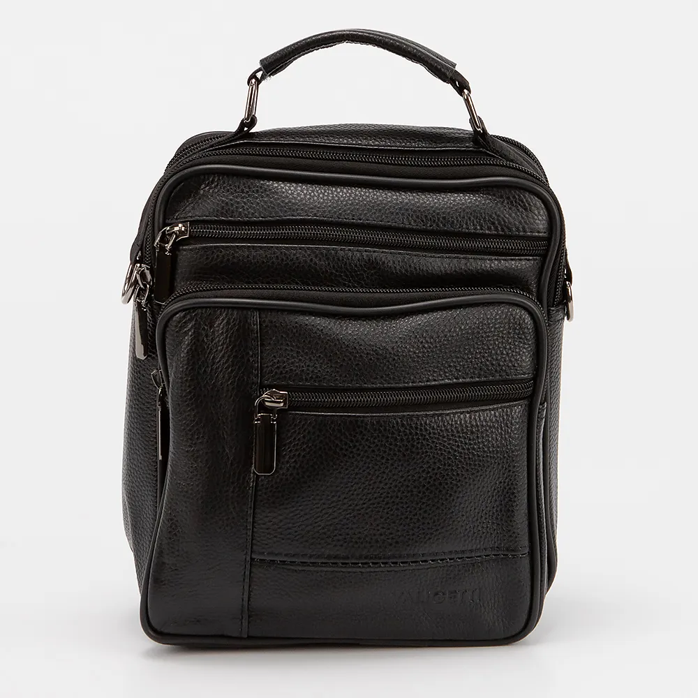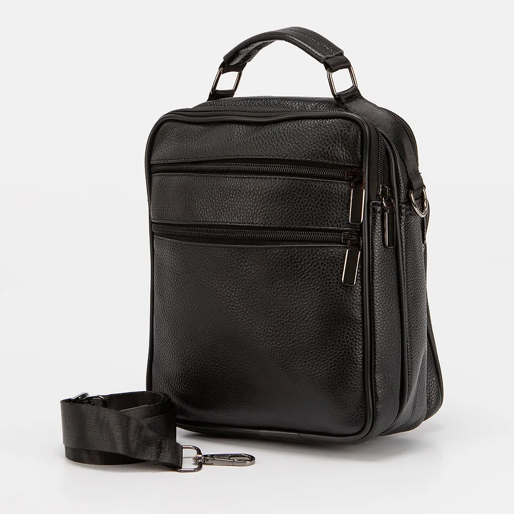 Сумка от торговой марки Valigetti выполнена из натуральной кожи черного цвета. Модель с ручкой для переноски и длинным регулируемым плечевым ремнем. Два отделения на молнии. С лицевой стороны - три кармана на молнии. С задней стороны - два кармана на молнии.