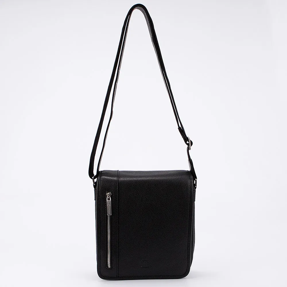 Стильный мужской планшет квадратной формы на несъемном плечевом ремне, декорированном кожаными вставками. Модель выполнена из натура льной кожи черного цвета, с одним текстильным отделением под откидным клапаном на магнитной кнопке. Внутри два накладных кармана без застежки, прорези для канцелярских принадлежностей и небольшой прорезной карман на молнии. Снаружи два прорезных кармана на молнии.