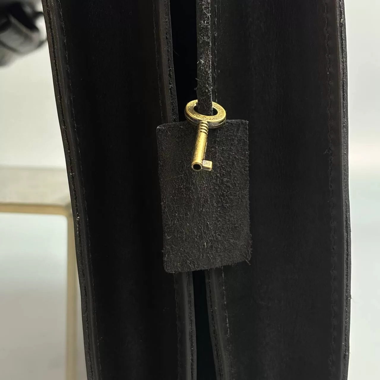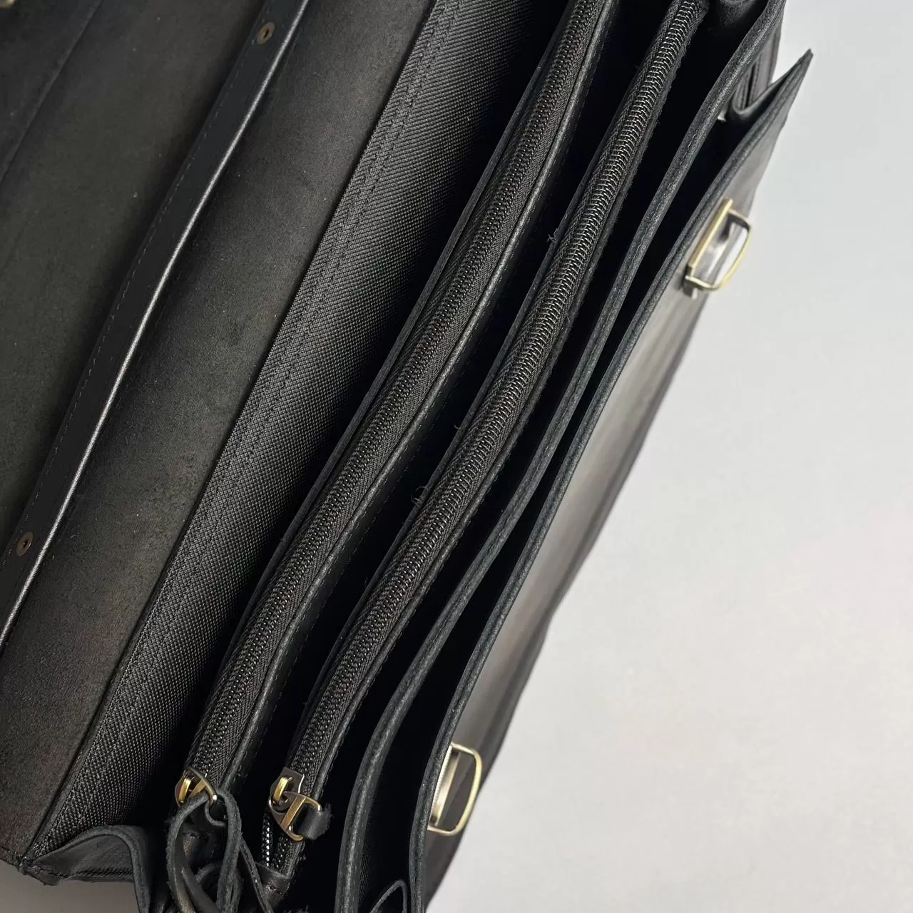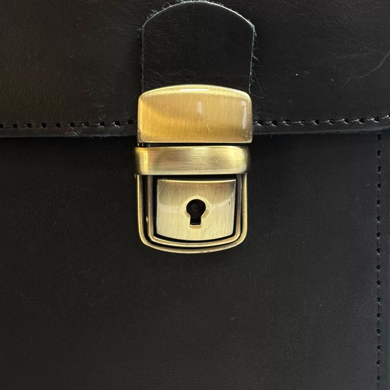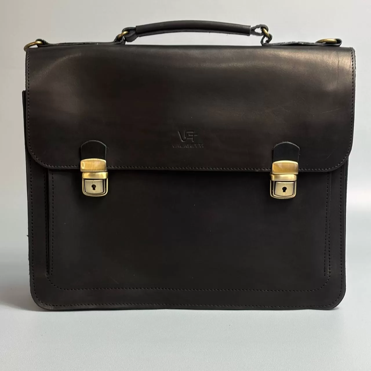 Классический мужской портфель Valigetti выполнен из натуральной кожи черного цвета. В модели предусмотрены два отдела, разделенные молнией, с текстильной отделкой. Портфель закрывается на клапан с металлическим замком-щеколдой, который открывается только при наличии ключа. Фурнитура выполнена из металла золотистого цвета. В комплект входит съемный регулируемый ремень на плечо, что позволяет удобно носить портфель с собой.