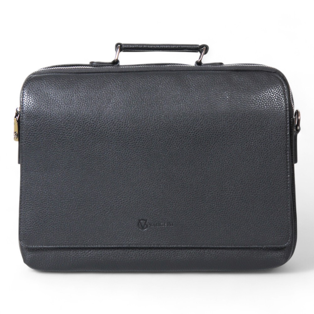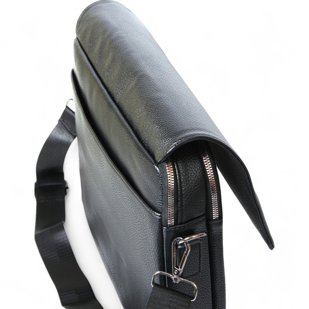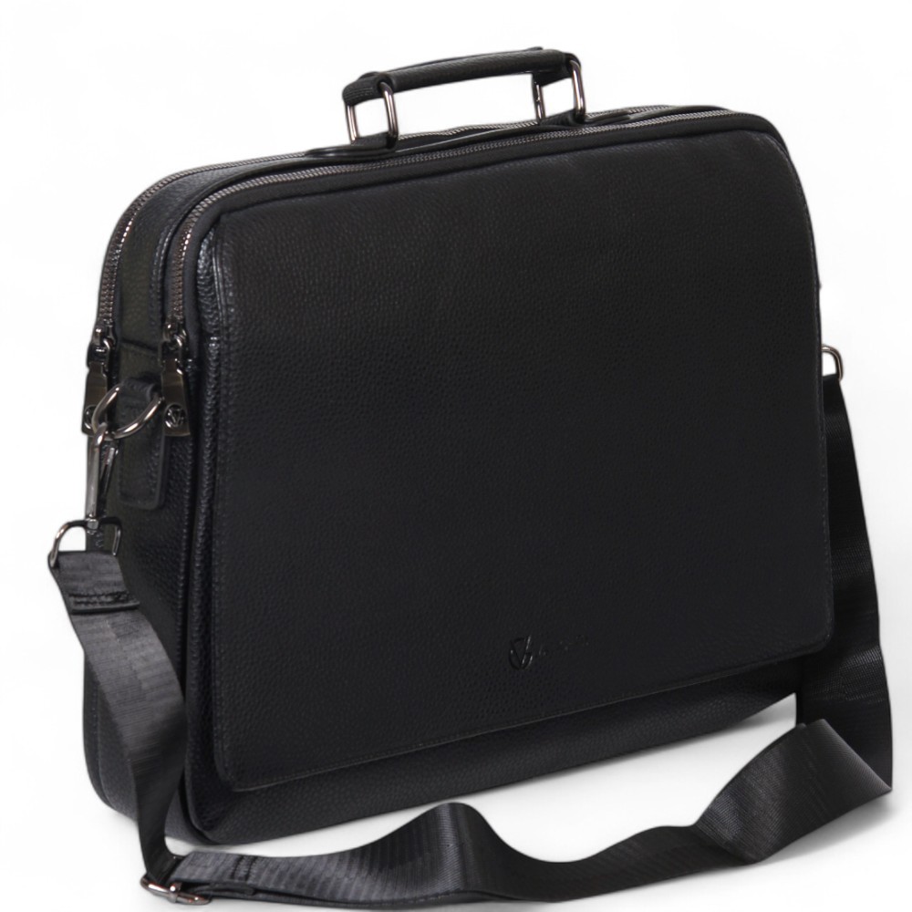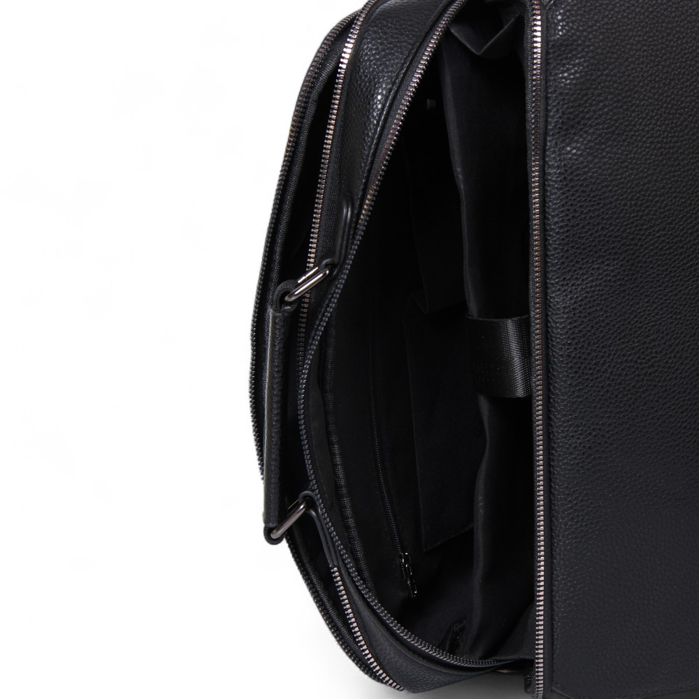 Портфель от бренда Valigetti выполнен из искусственной кожи черного цвета. Модель с ручкой и съемным плечевым ремнем, выполненным из текстильного материала. Два отделения на молнии. Внутри: текстильная подкладка, карман на молнии, накладной карман, карман с уплотненной стенкой для ноутбука. На лицевой стороне — накладной карман с клапаном. На задней стороне — карман на молнии.