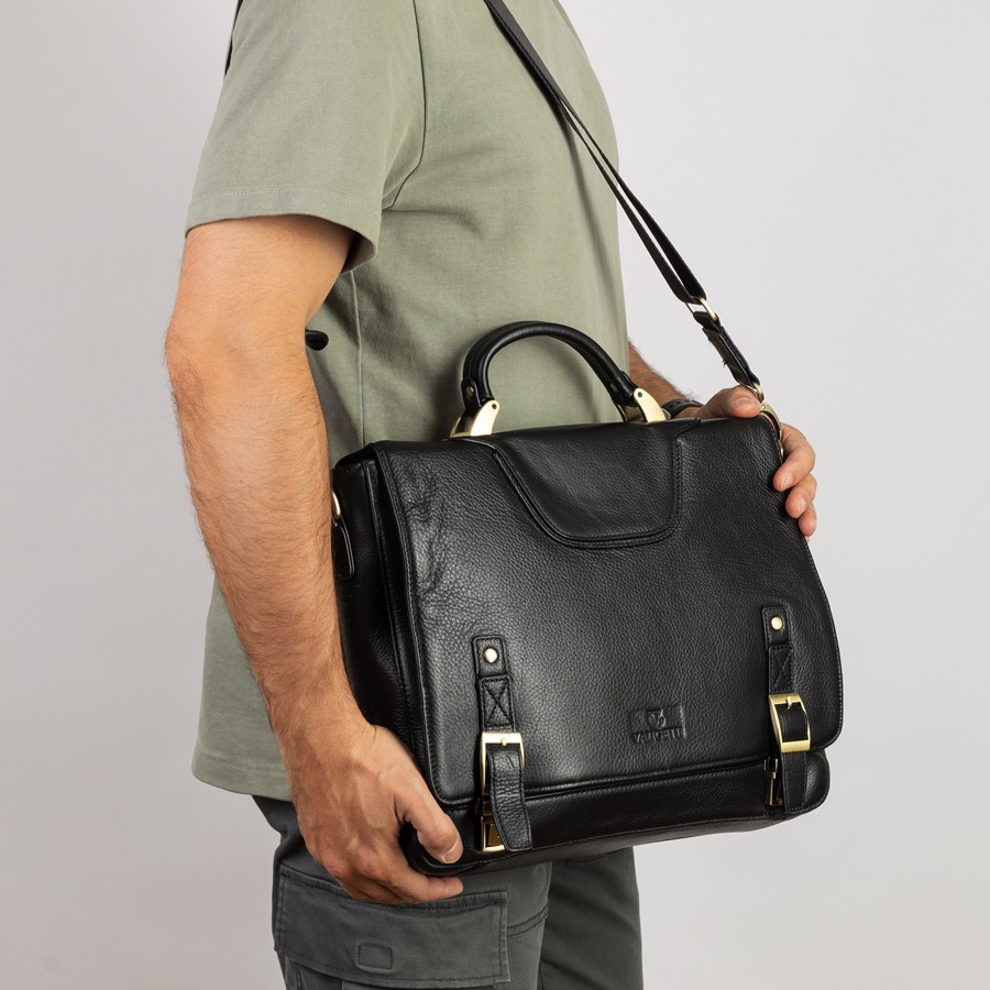 Портфель от торговой марки Valigetti из натуральной кожи черного цвета. Модель с одной ручкой, съемным регулируемым плечевым ремнем, выполненным из текстильного материала. Клапан на двух замках закрывает отделение без молнии. В отделении: фирменная подкладка, карман на молнии, мягкая перегородка-средник на молнии. На задней стороне – накладной карман на клапане.