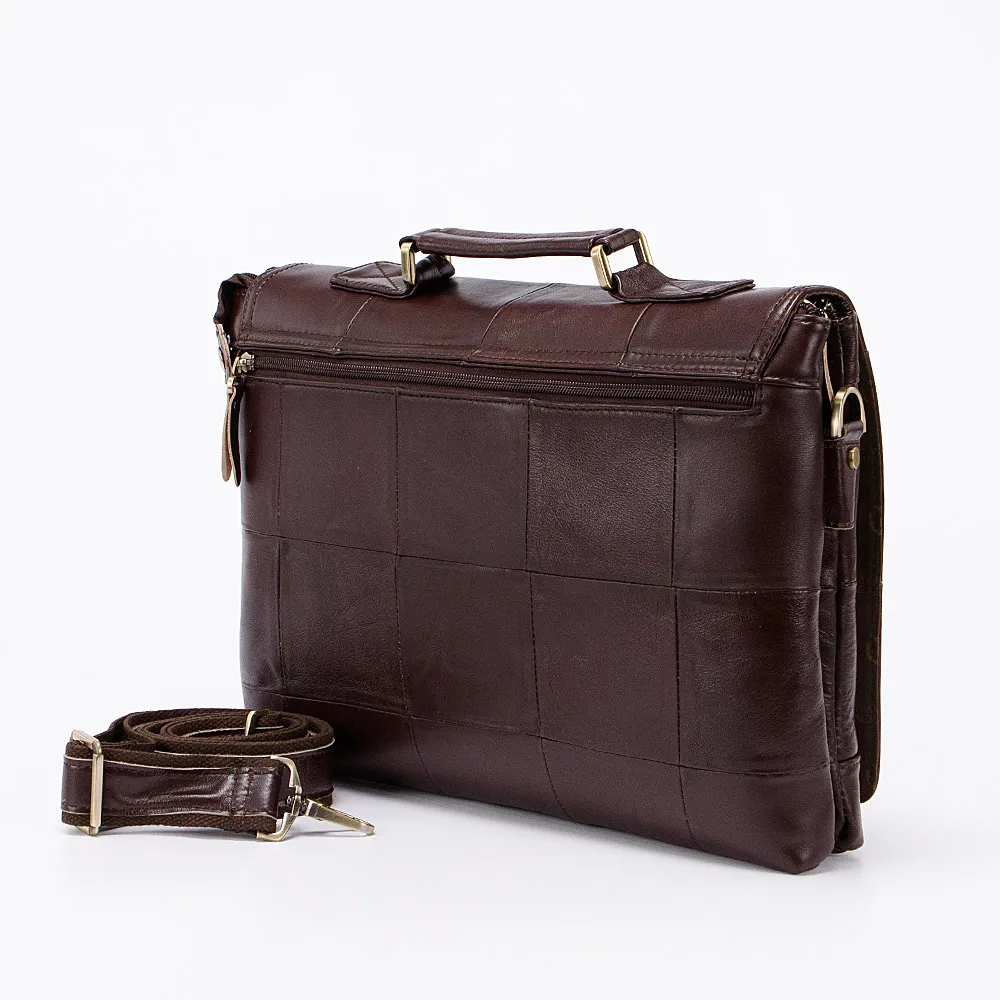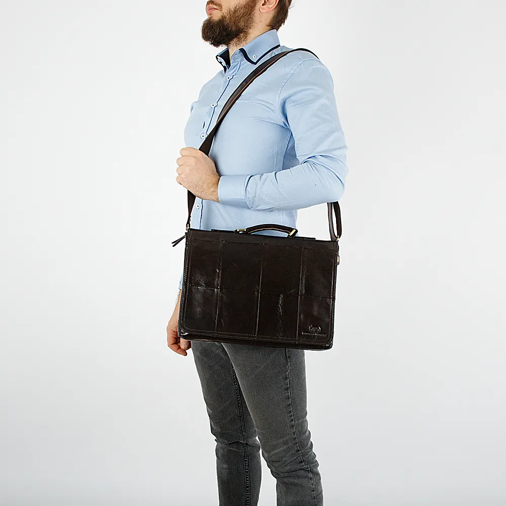 Брутальная деловая мужская сумка от бренда Francesco Molinary выполнена из мягкой и гладкой натуральной кожи в цвете тёмного шоколада. Клапан на двух магнитах и декорирован квадратными вставками, под ним карман на магните и карман на молнии, а также два независимых отделения на молниях, внутри которых средник на молнии и три дополнительных кармана. Снаружи сумка оснащена ручкой и прорезным карманом на молнии, в комплекте есть комбинированный регулируемый плечевой ремень, дополнена золотистой металлической фурнитурой.