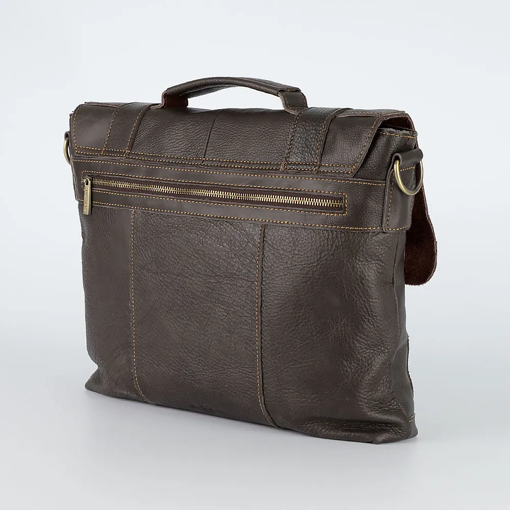 Сумка от торговой марки Poshete из натуральной кожи коричневого цвета с контрастной отстрчокой. Плоская вместительная модель с одной ручкой и съемным регулируемым плечевым ремнем. Закрывается клапаном на двух магнитных кнопках с декоративными ремнями. Отделение на молнии. Внутри: фирменная подкладка, плотные перегородки, карман на молнии, накладной карман. На задней стороне – карман на молнии.