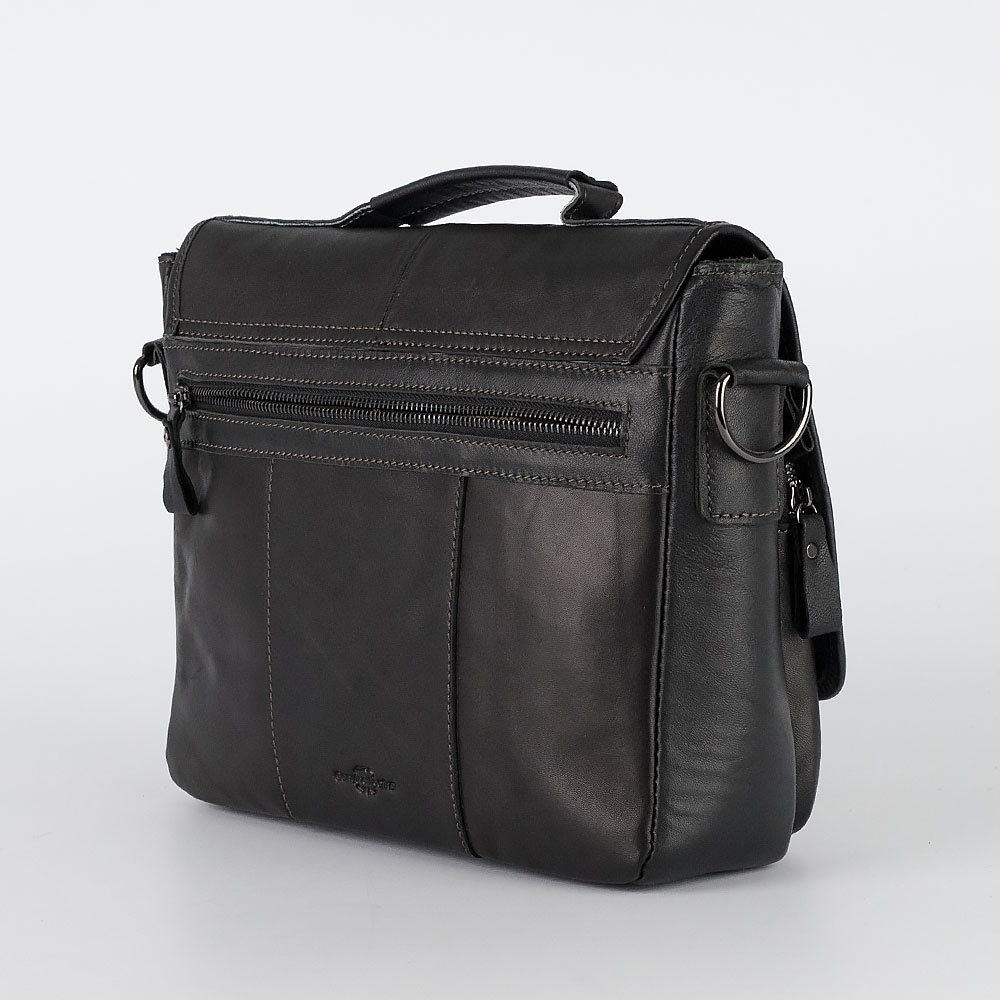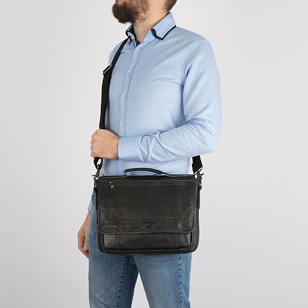 Современная мужская сумка от бренда Poshete выполнена из натуральной кожи в чёрном цвете. Сумка горизонтальной прямоугольной формы, вместительная. Снаружи одна ручка для переноски, съёмный плечевой ремень из плотного текстиля и клапан с карманом на молнии, под клапаном ещё карман на молнии и основное отделение с текстильной подкладкой.