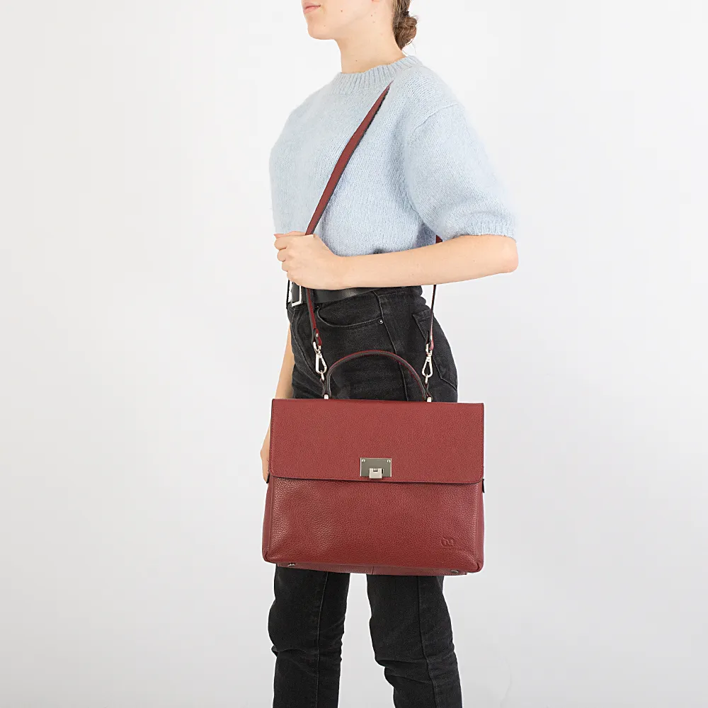 Женский портфель от торговой марки Poshete из натуральной кожи темно-синего цвета. Модель с одной ручкой и съемным регулируемым плечевым ремнем. Закрывается клапаном на откидном замке. Три отделения с фирменной подкладкой. Крайние отделения без застежки. Среднее отделение на молнии. Внутри: карман на молнии, два накладных кармана. На задней стороне – карман на молнии. Дно оснащено ножками для защиты от износа.