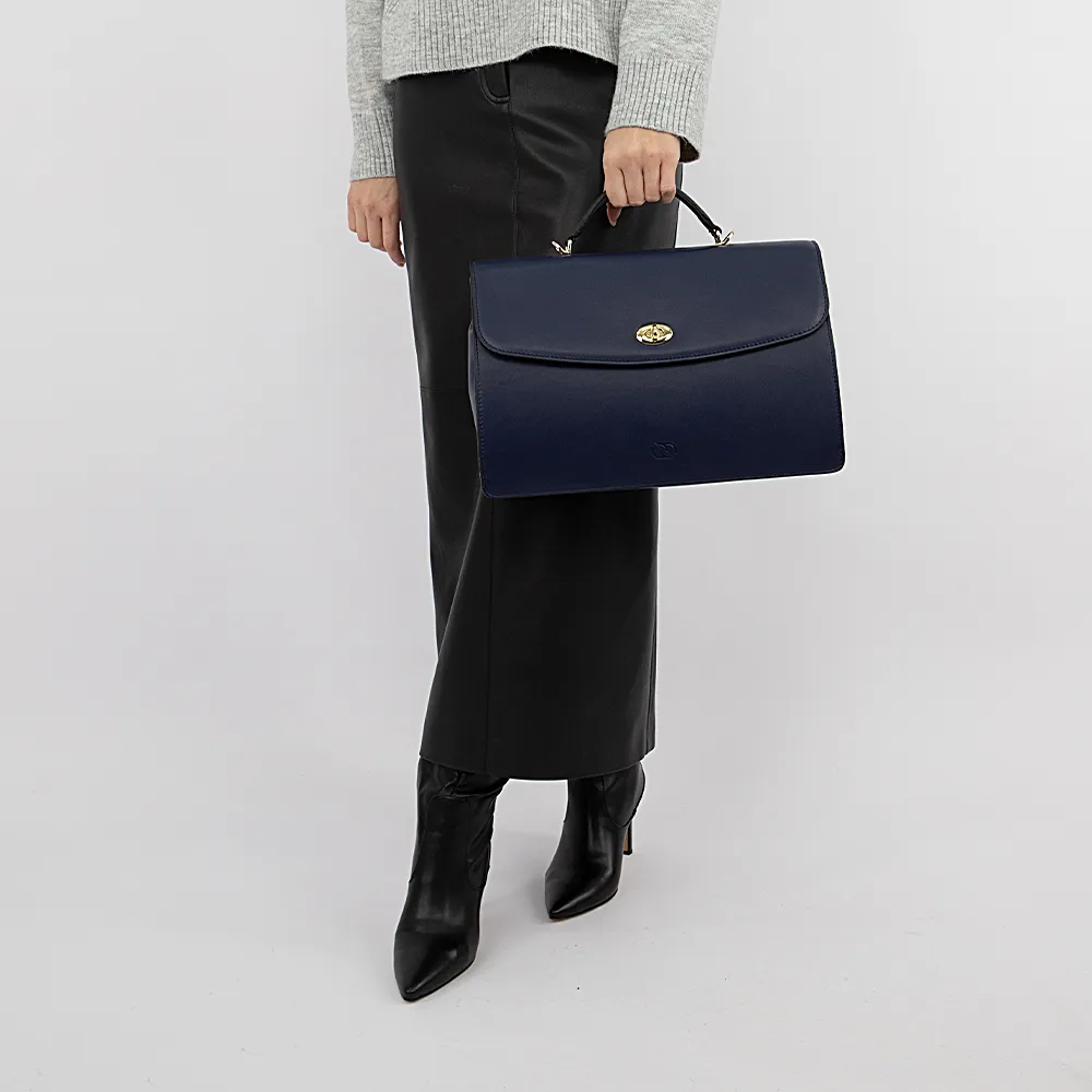 Женский портфель от торговой марки Francesco Molinary из натуральной кожи синего цвета. Жесткая элегантная модель с одной плотной ручкой и съемным плечевым ремнем. Закрывается клапаном на поворотном замке. Отделение с фирменной подкладкой. Внутри: плотная перегородка, органайзер для канцелярских принадлежностей, перегородка с карманом на молнии, образующая накладной карман. На задней стороне – накладной карман без застежки.