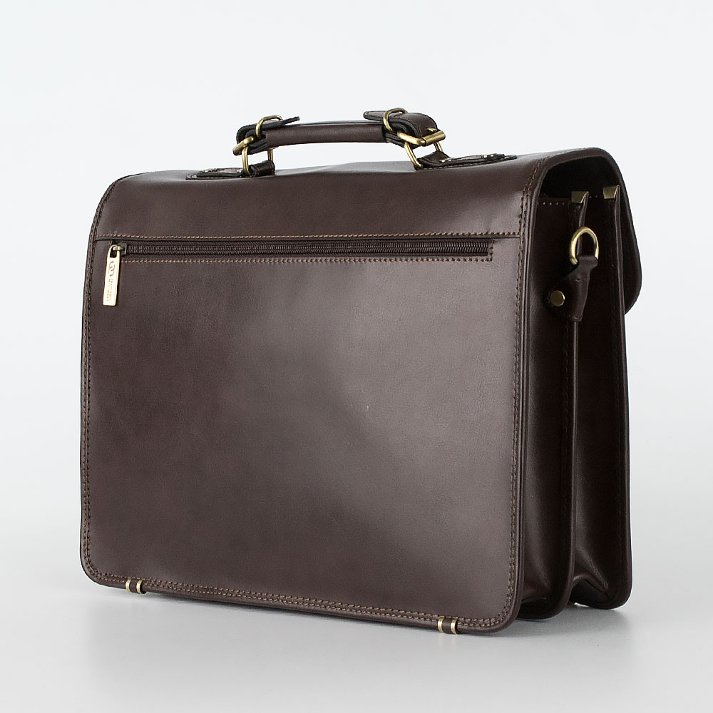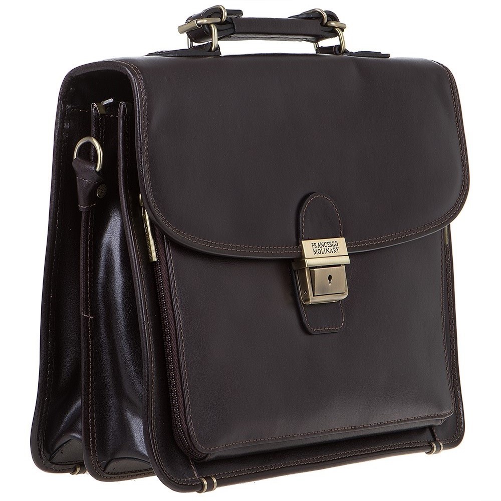 Мужской портфель Francesco Molinary из гладкой натуральной кожи, благородного тёмно-коричневого цвета на металлической, золотистой застёжке. Имеет приятную слегка закруглённую форму и крепкую кожаную ручку. Настоящий органайзер. Два вместительных отсека разделены текстильным средником на молнии. И дополнительный раздел с боковыми молниями для расширения. А также кармашки для ручек, визиток и один не большой на молнии. На портфеле аккуратный тиснёный логотип и ничего лишнего. Для важных документов деловых мужчин.