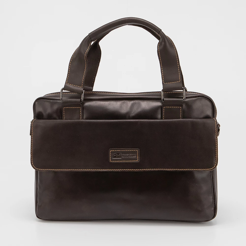 Деловая сумка от бренда Francesco Molinary выполнена из натуральной кожи в коричневом цвете. Модель с двумя ручками и съемным регулируемым плечевым текстильным ремнем. Основное отделение на молнии, внутри: фирменная текстильная подкладка, накладной открытый карман и накладной карман на кнопке. На лицевой стороне расположен карман на клапане с магнитными кнопками, на задней стороне расположен карман быстрого доступа на молнии.
