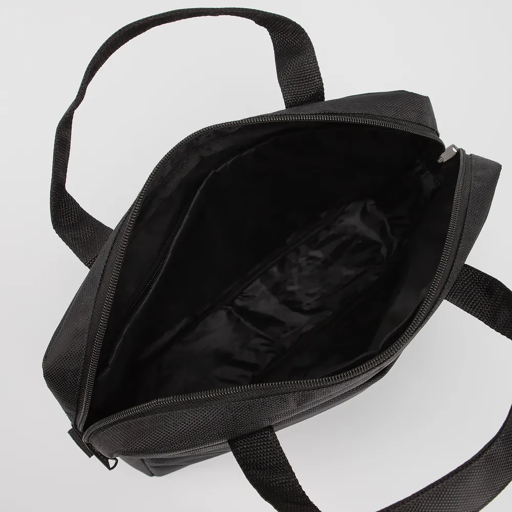 Мужская сумка для ноутбука от бренда Mr. Bag. Модель выполнена из плотного текстиля практичного черного цвета, внутри одно основное отделение для документов формата А4, карман на молнии. Застегивается на молнию. С лицевой и задней стороны - карман на молнии. Модель на двух удобных ручках для переноса, дополнена съемным регулируемым плечевым ремнем.